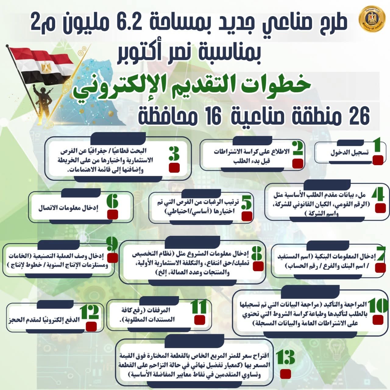 ● اليوم بدء تلقي طلبات المستثمرين على 1128 قطعة أرض صناعية مرفقة مطروحة من الوزارة بمناسبة ذكرى انتصارات اكتوبر المجيدة