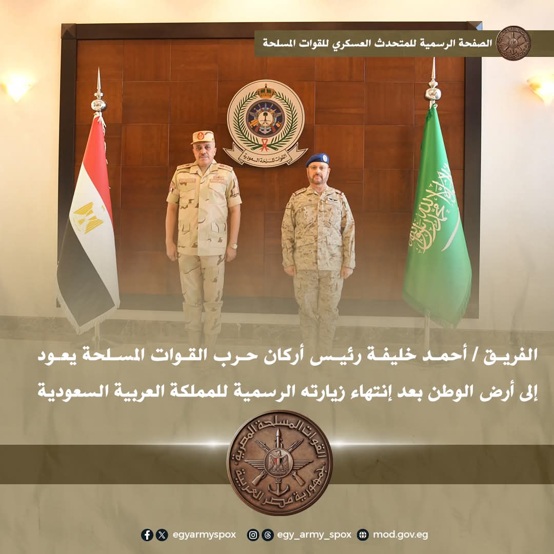 عاد إلى أرض الوطن الفريق / أحمد خليفة رئيس أركان حرب القوات المسلحة والوفد المرافق له بعد إنتهاء زيارته الرسمية للمملكة العربية السعودية ، حيث أجريت له مراسم إستقبال رسمية وإستعراض حرس الشرف وعزفت الموسيقات العسكرية السلام الوطنى لكلا البلدين ، وترأس رئيس أركان حرب القوات المسلحة مع الفريق أول الركن / فياض بن حامد الرويلى رئيس هيئة الأركان العامة للقوات المسلحة السعودية الجلسة الختامية للإجتماع الحادى عشر للجنة التعاون العسكرى المصرى السعودى ، وأسفرت إجتماعات اللجنة عن التوافق حول تعزيز أوجه التعاون العسكرى بين القوات المسلحة المصرية والسعودية بمختلف المجالات العسكرية .