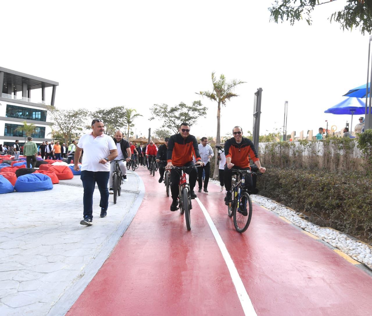 حيث قام السادة الوزراء بجولة داخل أرجاء النادي بالدراجات، الذي أُقيم على أحدث الطرز الإنشائية ويضم مجموعة متكاملة من المنشآت الرياضية والخدمية والاجتماعية، منها ملاعب كرة القدم الخماسية والتنس والاسكواش، ومجمع حمامات السباحة، وصالة الجيمانيزيوم، والمبنى الاجتماعي، والمطاعم والكافيتريات، بما يجعله نموذجاً متكاملاً للأندية الحديثة التي توفر خدمات متكاملة للأعضاء وروادها من مختلف الفئات العمرية، اعقبها مباراة كرة قدم بين السادة الوزراء.