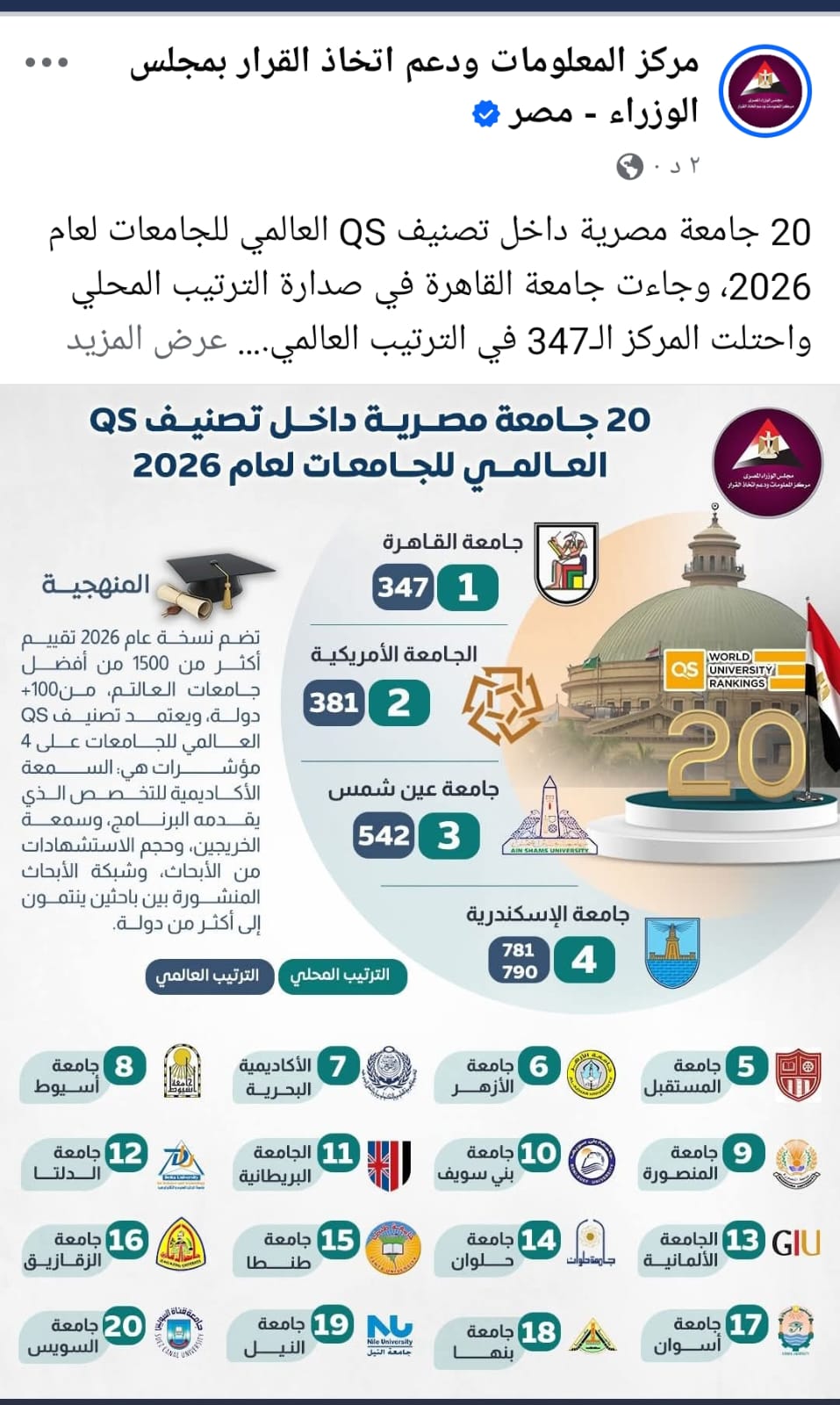 جامعة القاهرة في صدارة الترتيب المحلي وتحتل المركز الـ347 في الترتيب العالمي