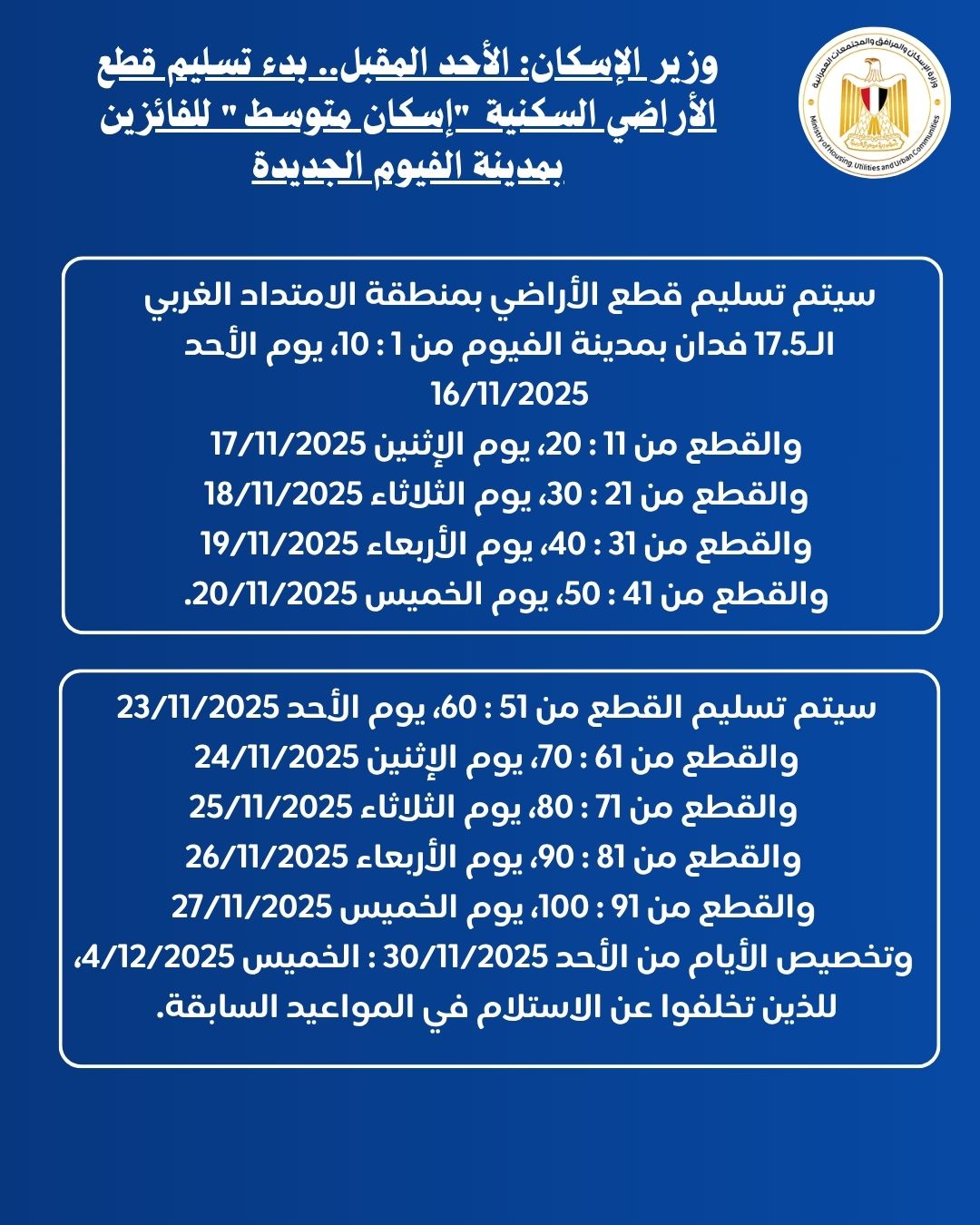 وبدوره أوضح المهندس شريف عبد البديع – رئيس جهاز تنمية مدينة الفيوم الجديدة والمشرف على مدينة الفشن الجديدة، أنه سيتم تسليم قطع الأراضي بمنطقة الامتداد الغربي الـ17.5 فدان بمدينة الفيوم من 1 : 10، يوم الأحد 16/11/2025، والقطع من 11 : 20، يوم الإثنين 17/11/2025، والقطع من 21 : 30، يوم الثلاثاء 18/11/2025، والقطع من 31 : 40، يوم الأربعاء 19/11/2025، والقطع من 41 : 50، يوم الخميس 20/11/2025.