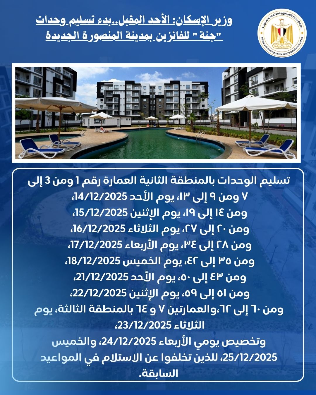 أعلن المهندس شريف الشربيني، وزير الإسكان والمرافق والمجتمعات العمرانية، عن بدء تسليم عمارات مشروع “جنة” للفائزين بعدة مناطق بمدينة المنصورة الجديدة، وذلك اعتباراً من يوم الأحد المقبل 16/11/2025، وحتى يوم الخميس 1/1/2026، وفقاً للمواعيد المقررة.