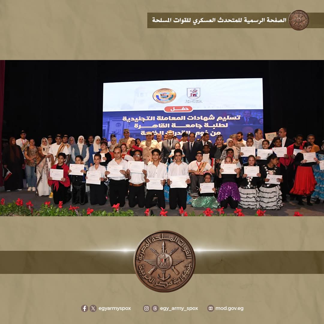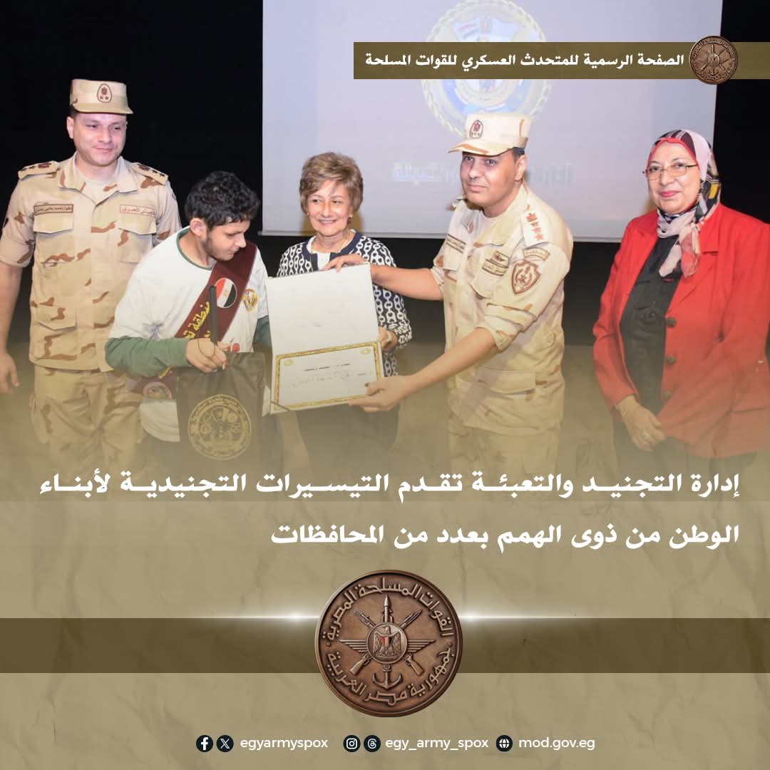 إستمراراً لدور القوات المسلحة فى تقديم كافة أوجه الرعاية لأبناء الوطن من ذوى الهمم دفعت إدارة التجنيد والتعبئة عدداً من اللجان التجنيدية الطبية إلى محافظات الجيزة وأسيوط والسويس والأسكندرية وبورسعيد والقليوبية لتقديم كافة التيسيرات التجنيدية لذوى الهمم ، وذلك بالتنسيق مع كافة الجهات المعنية بالمحافظات لتجميع الحالات المستحقة وإجراء الكشف الطبى عليهم ومنحهم شهادات المعاملة التجنيدية بالمجان .
