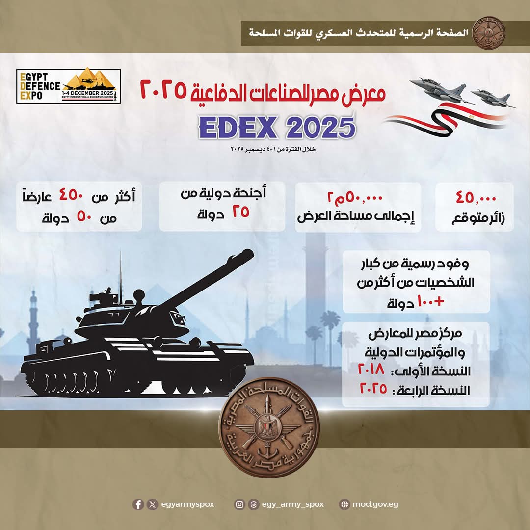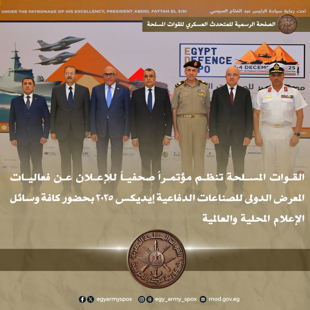 نظمت القوات المسلحة مؤتمراً صحفياً عالمياً بحضور مختلف وسائل الإعلام المحلية والدولية للإعلان عن فعاليات المعرض الدولى للصناعات الدفاعية ” إيديكس 2025 ” فى دورته الرابعة والذى سيتم تنظيمه على أرض مصر بمركز مصر للمعارض والمؤتمرات الدولية خلال الفترة من 1 – 4 / 12 / 2025 تحت رعاية السيد الرئيس / عبد الفتاح السيسى رئيس جمهورية مصر العربية القائد الأعلى للقوات المسلحة وبمشاركة كبار العارضين والشركات العالمية فى مجال التسليح والصناعات الدفاعية والأمنية على الصعيدين الإقليمى والدولى .