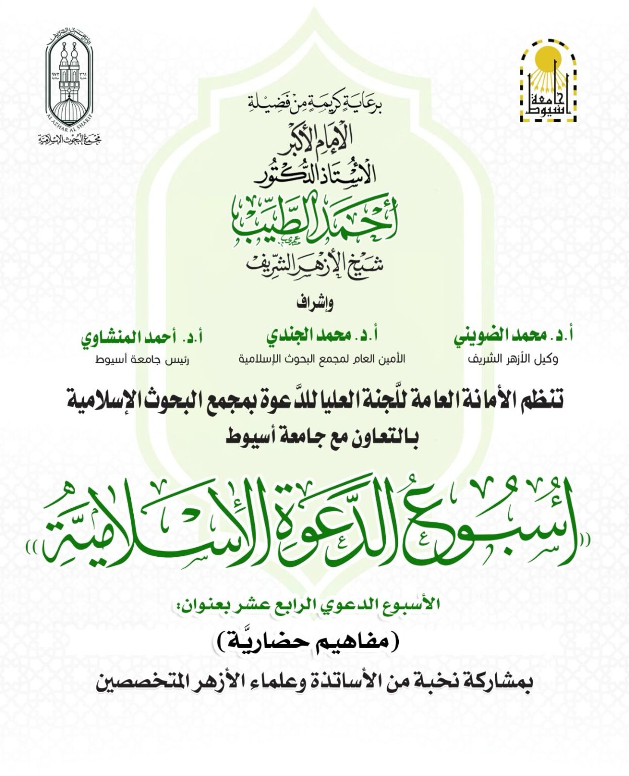 ينظِّم مجمع البحوث الإسلامية الأحد المقبل، فعاليَّات الأسبوع الرابع عشر للدَّعوة الإسلاميَّة، الذي تعقده اللجنة العُليا للدَّعوة في جامعة أسيوط تحت عنوان: (مفاهيم حضاريَّة)، برعايةٍ كريمةٍ مِنْ فضيلة الإمام الأكبر أ.د. أحمد الطيِّب، #شيخ_الأزهر الشريف، وإشراف فضيلة أ.د. محمد الضويني، وكيل الأزهر، وفضيلة أ.د. محمد الجندي، الأمين العام لمجمع البحوث الإسلاميَّة.