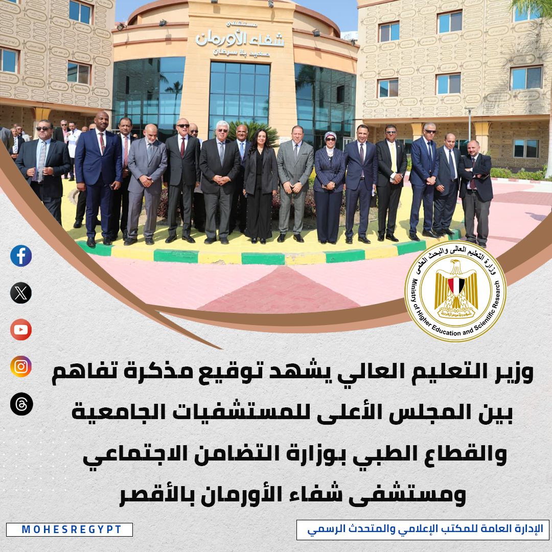 شهد الدكتور أيمن عاشور وزير التعليم العالي والبحث العلمي، والدكتورة مايا مرسي وزيرة التضامن الاجتماعي، والمهندس عبدالمطلب عمارة محافظ الأقصر، توقيع مذكرة تفاهم بين المجلس الأعلى للمستشفيات الجامعية، والقطاع الطبي بوزارة التضامن الاجتماعي، ومستشفى شفاء الأورمان بالأقصر، وتهدف مذكرة التفاهم إلى إدماج مستشفى شفاء الأورمان الأقصر ضمن المنظومة الأكاديمية والتدريبية للمجلس الأعلى للمستشفيات الجامعية كمستشفى منتسب أكاديميًا وفنيًا، بما يضمن التبعية في التدريب والإشراف الفني والجودة التعليمية، وفقًا للمعايير الوطنية المعتمدة، فضلًا عن تعزيز كفاءة التشغيل وتقديم الرعاية الصحية، ودعم برامج التدريب والتعليم الطبي للأطباء والكوادر الصحية، والعمل على تفعيل برامج التوعية والتثقيف المجتمعي، وتحديث الدور الوقائي للخدمات الصحية، والمشاركة في تنظيم القوافل الطبية وخدمات الرعاية الميدانية في المناطق النائية والأكثر احتياجًا، وتعظيم الموارد المتاحة لصالح الفئات الأولى بالرعاية في المجتمع، وتنظيم حملات وقوافل طبية مشتركة، وعلى هامش توقيع مذكرة التفاهم، قام الوزيران بجولة تفقدية للمستشفى واستمعا إلى شرح تفصيلي حول الأقسام المختلفة للمستشفى والخدمات العلاجية العديدة التي تقدمها المستشفى.