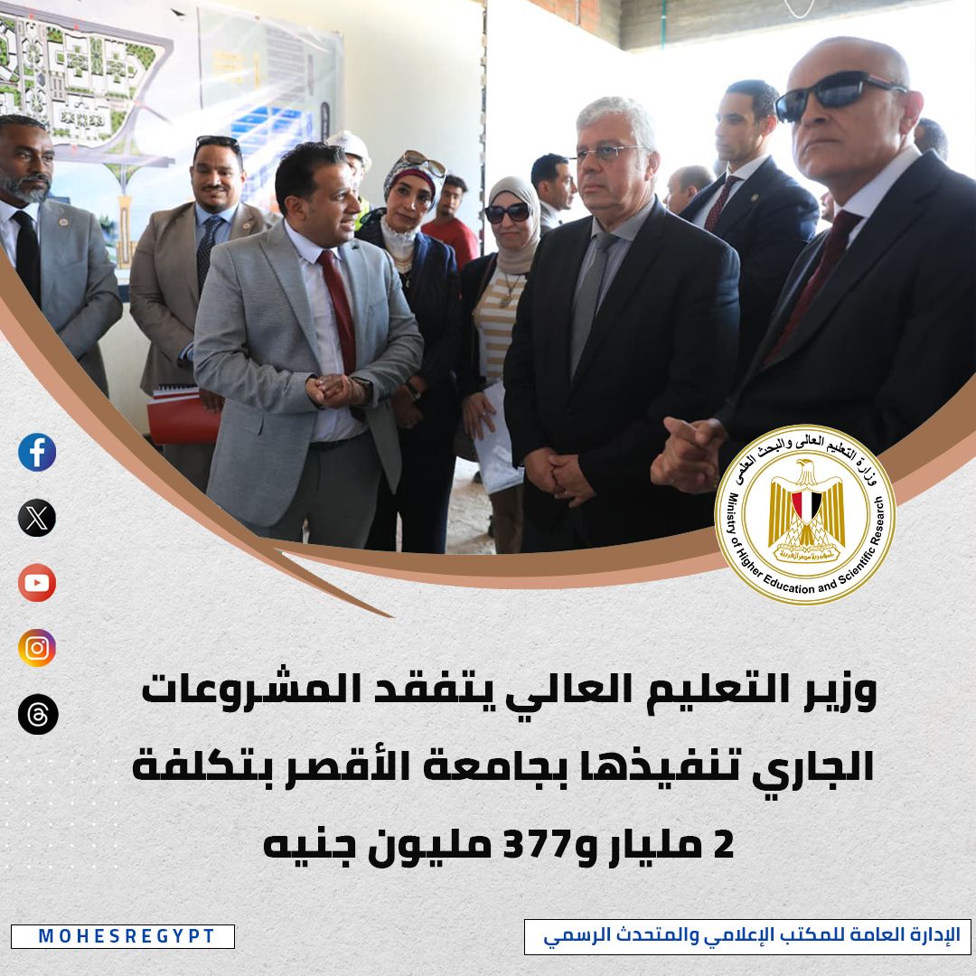 قام الدكتور أيمن عاشور وزير التعليم العالي والبحث العلمي، والمهندس عبدالمطلب عمارة محافظ الأقصر، والدكتورة صابرين عبدالجليل رئيس جامعة الأقصر، بتفقد عدد من المشروعات التعليمية والصحية الجاري تنفيذها بجامعة الأقصر، بتكلفة تقديرية تبلغ 2 مليار و377 مليون جنيه، وتفقد الوزير الأعمال الإنشائية الجارية في المستشفى الجامعي بجامعة الأقصر، كما تفقد الوزير مباني كلية الهندسة، ومبنى كلية طب الفم والأسنان، وأكد الوزير أن هذه المشروعات تأتي في إطار خطة التطوير والتوسع المستمر في مباني ومنشآت جامعة الأقصر، بما يعكس حرص الدولة في ضوء الدعم غير المحدود من القيادة السياسية على توفير بيئة تعليمية متكاملة، موضحًا أن هذا التوسع في المنشآت بالجامعة يسير بالتوازي مع جهود التطوير النوعي التي تنفذها الجامعة على مستوى الخدمة التعليمية والبحثية، وفقًا لمحاور وأهداف الإستراتيجية الوطنية للتعليم العالي والبحث العلمي 2030؛ بما يسهم في الارتقاء بجودة مخرجات التعليم العالي، وتلبية احتياجات المجتمع وسوق العمل.