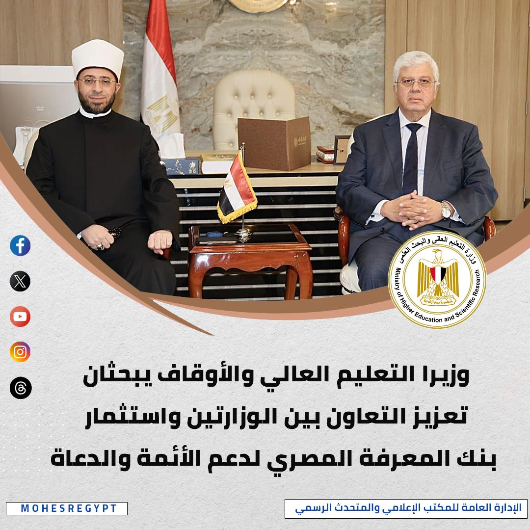 عقد د.أيمن عاشور وزير التعليم العالي والبحث العلمي اجتماعًا مع د.أسامة الأزهري وزير الأوقاف؛ لبحث سبل التعاون بين الوزارتين، وبحث آليات الاستفادة من الخدمات المتنوعة التي يقدمها بنك المعرفة المصري، وخلال الاجتماع أكد الجانبان أهمية توحيد الجهود للاستفادة من البنية التحتية المعرفية المتاحة ودمج المحتوى الديني ضمن بنك المعرفة وفق الضوابط العلمية؛ بهدف نشر الثقافة الإسلامية ومفاهيمها الصحيحة، وذلك من خلال بروتوكول تعاون بين الوزارتين لتنسيق آليات اختيار المحتوى وضمان جودته، كما تطرق الاجتماع إلى التعاون في تحويل سلاسل التراث والمخطوطات التابعة لوزارة الأوقاف إلى مضمون رقمي يتم عرضه من خلال بنك المعرفة؛ لتوسيع حجم الاستفادة منه على المستوى المحلي والإقليمي والدولي.