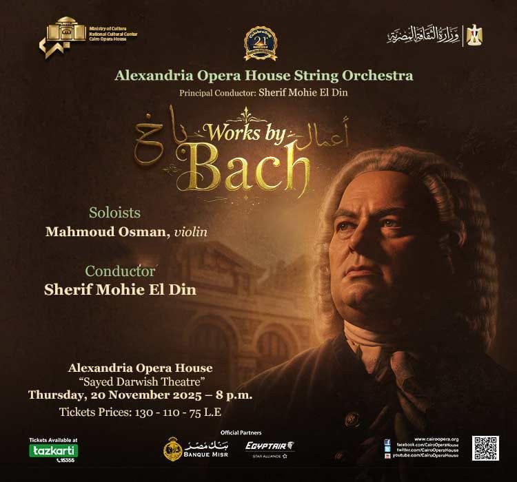 تقيم دار الأوبرا المصرية برئاسة الدكتور علاء عبد السلام حفلا لأوركسترا وتريات أوبرا الإسكندرية بقيادة المايسترو شريف محيى الدين ومشاركة عازف الفيولينة الدكتور محمود عثمان وذلك فى الثامنة مساء الخميس 20 نوفمبر على مسرح سيد درويش ” أوبرا الاسكندرية ” يتضمن مجموعة من اهم أعمال المؤلف الموسيقى العالمى باخ .