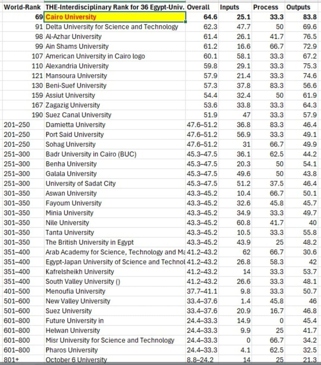 أعلنت جامعة القاهرة عن تحقيق إنجاز دولي جديد يُضاف إلى سجل ريادتها الأكاديمية، بتصدرها الجامعات المصرية واحتلالها المرتبة 69 عالميًا في تصنيف Times Higher Education للتخصصات البينية لعام 2026 (Interdisciplinary Science Rankings)، والذي يُعد أحد أحدث التصنيفات النوعية المتخصصة التي تقيس أداء الجامعات في مجالات البحث العلمي متعدد التخصصات.