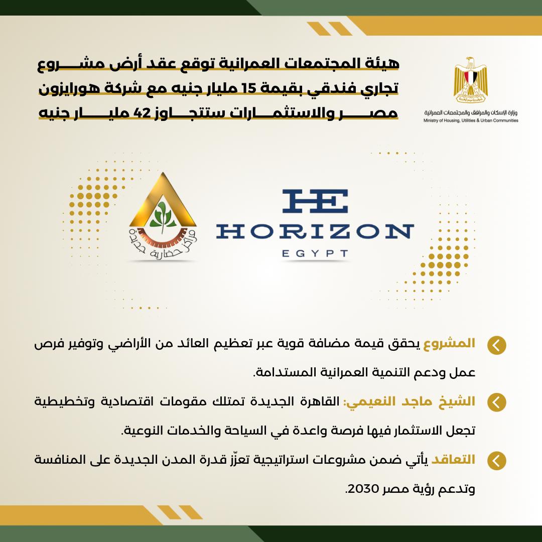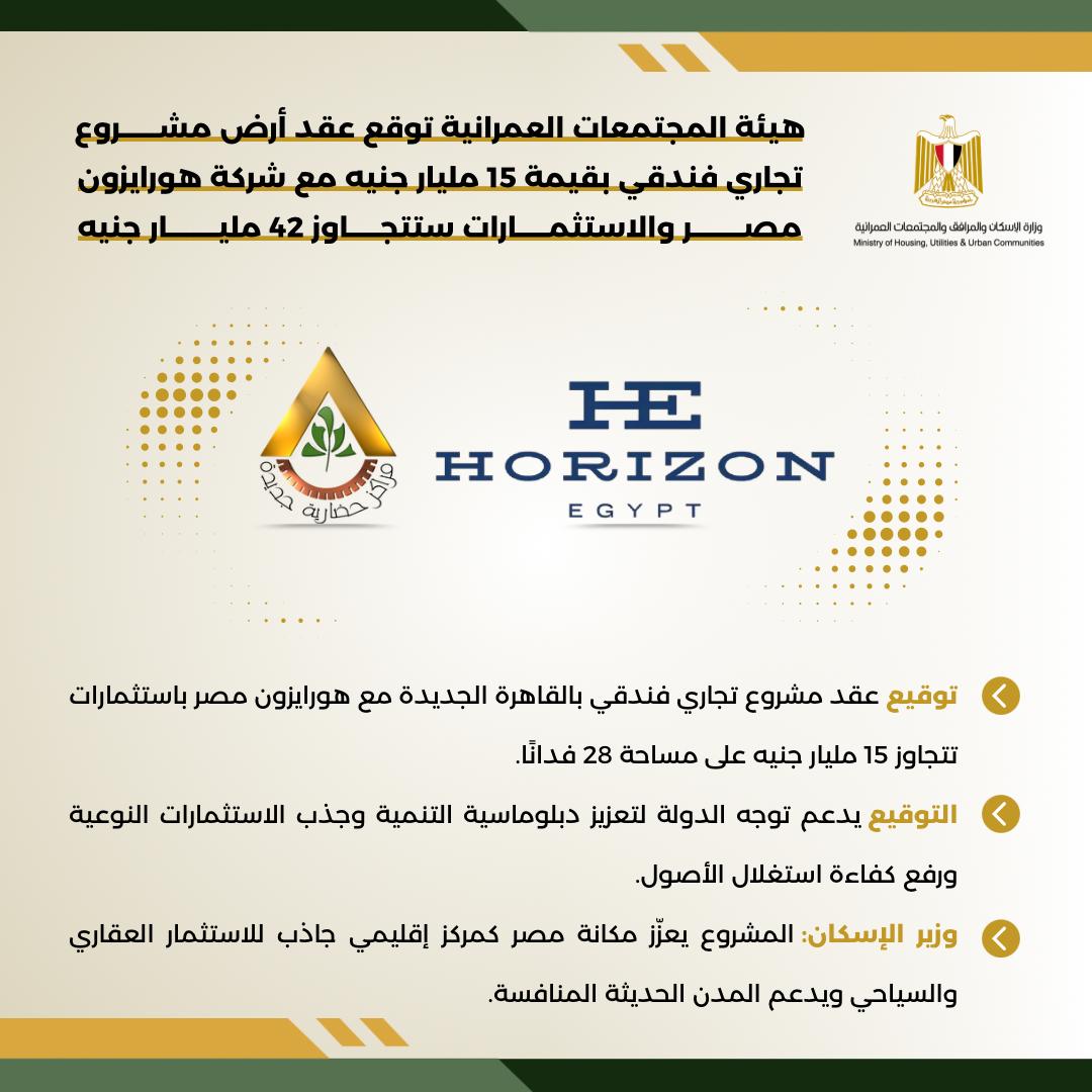 في إطار توجه الدولة نحو تعزيز دبلوماسية التنمية وجذب الاستثمارات النوعية، شهدت هيئة المجتمعات العمرانية الجديدة مراسم توقيع عقد تخصيص أرض مشروع تجاري فندقي متميز بمدينة القاهرة الجديدة، على مساحة تقارب 28 فدانًا، بقيمة تتجاوز 15 مليار جنيه مصري مع شركة هورايزون مصر للتنمية العمرانية، ، والاستثمارات ستتجاوز 42 مليار دولار .