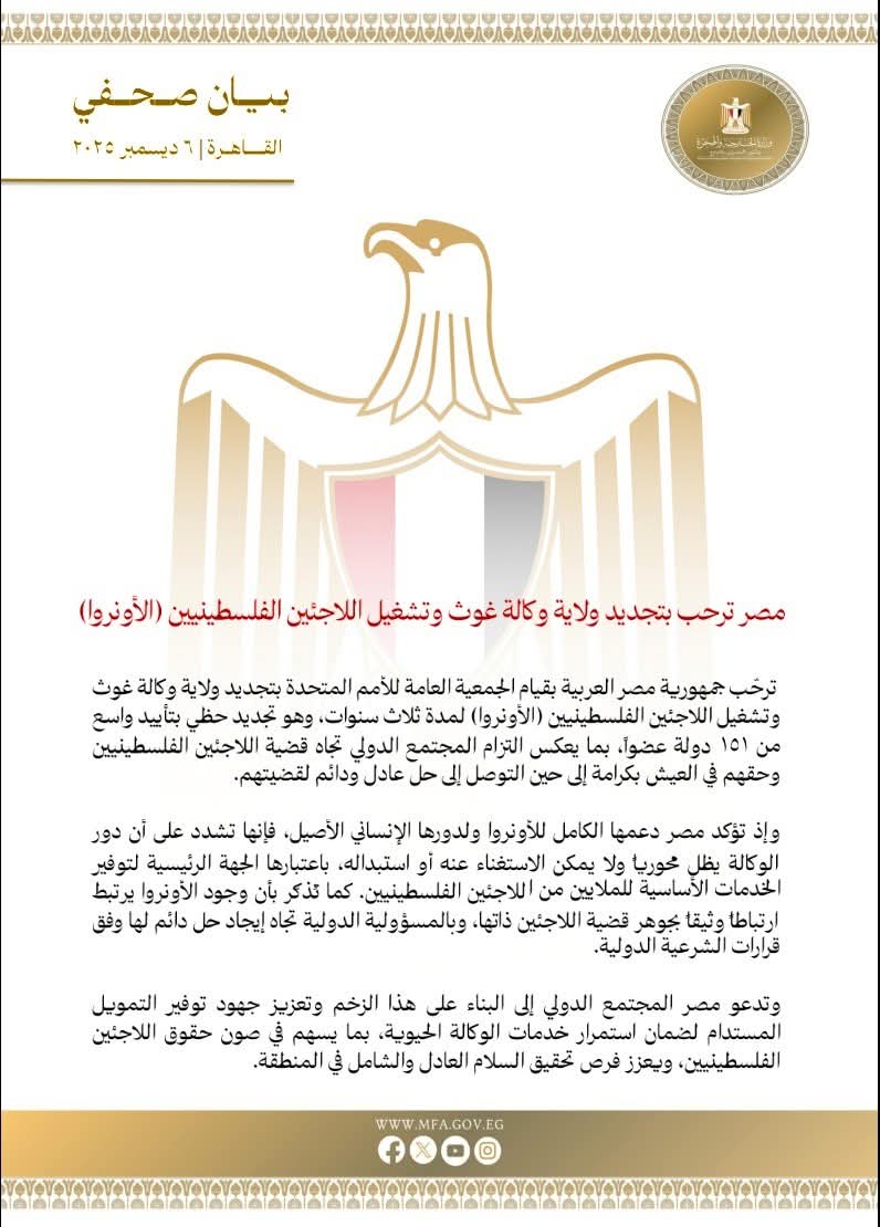 ترحّب جمهورية مصر العربية بقيام الجمعية العامة للأمم المتحدة بتجديد ولاية وكالة غوث وتشغيل اللاجئين الفلسطينيين (الأونروا) لمدة ثلاث سنوات، وهو تجديد حظي بتأييد واسع من ١٥١ دولة عضواً، بما يعكس التزام المجتمع الدولي تجاه قضية اللاجئين الفلسطينيين وحقهم في العيش بكرامة إلى حين التوصل إلى حل عادل ودائم لقضيتهم.