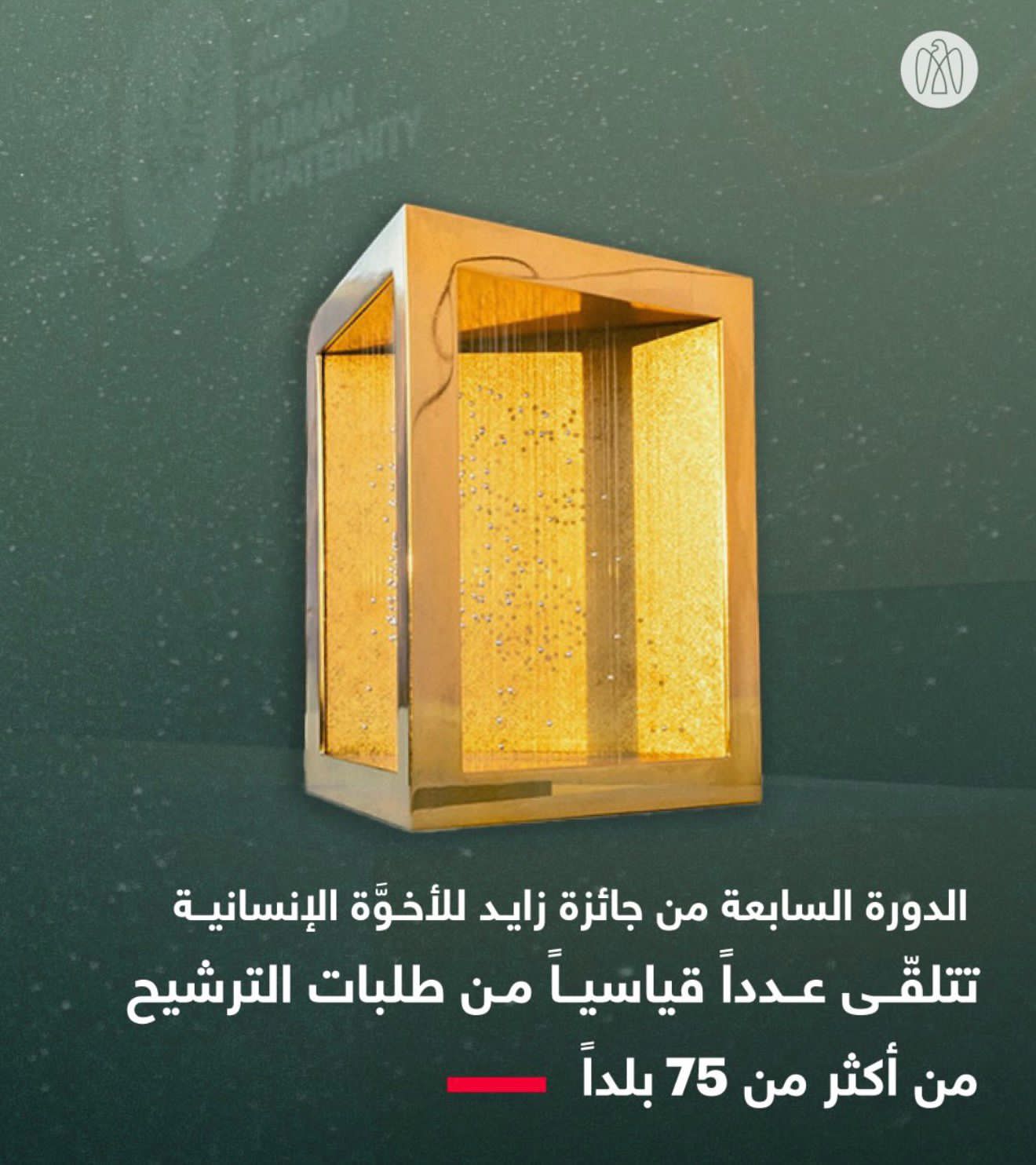 أعلنت جائزة زايد للأخوّة الإنسانية عن تلقّي لجنة تحكيم الجائزة عدداً قياسياً من طلبات الترشيح من أكثر من 75 بلداً لدورتها السابعة، التي تُعقَد في عام 2026، من قِبَل المُرشِّحين المؤهلين من فئات مختلفة تتضمَّن رؤساء دول، وحائزين جائزة نوبل للسلام، ونشطاء مجتمعيين، وروّاداً من الشباب المعروفين بجهودهم في خدمة قضايا الأخوَّة الإنسانية.