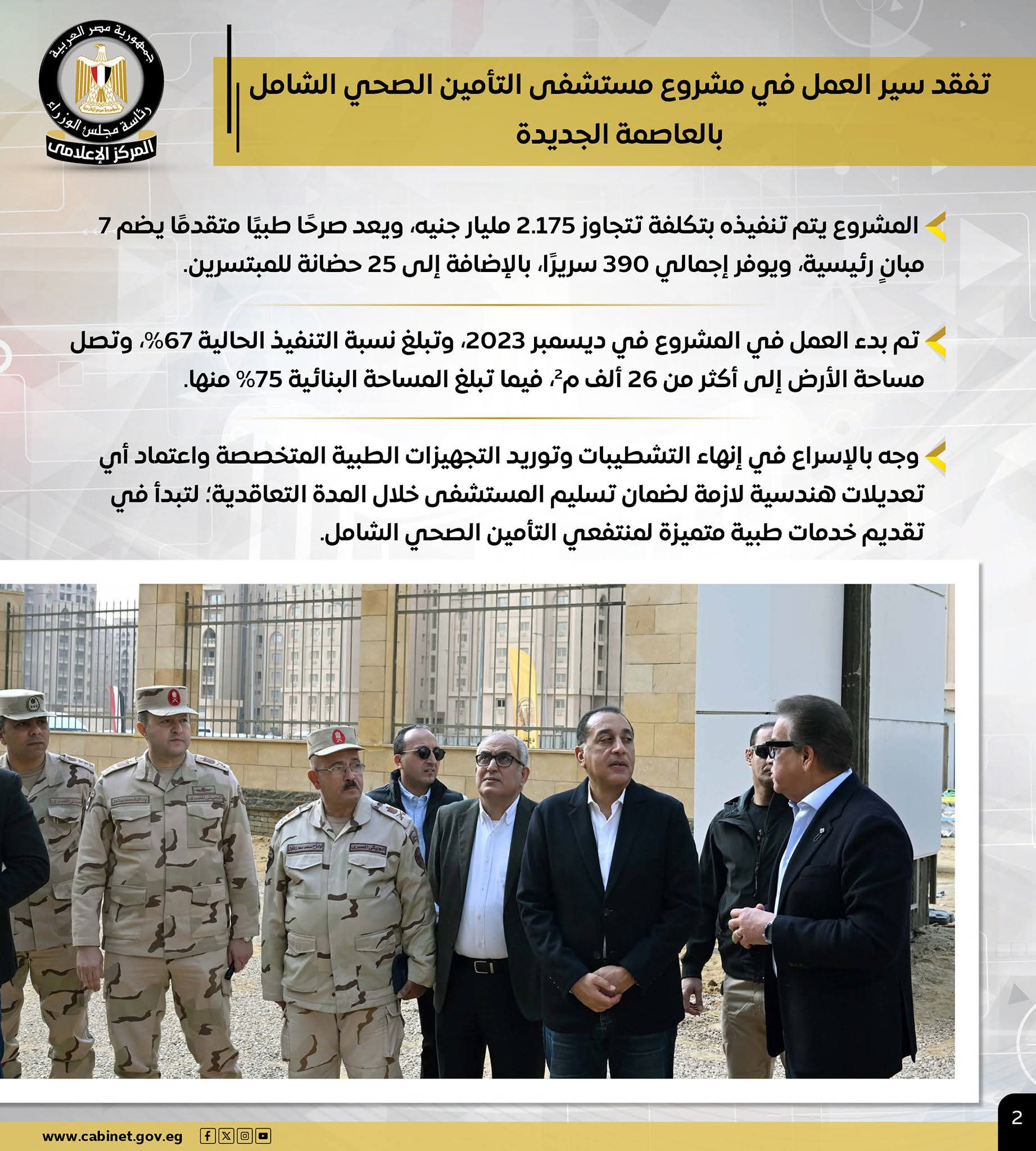 – بتكلفة تتجاوز 2.175 مليار جنيه.. رئيس الوزراء يتابع مستجدات تنفيذ مستشفى التأمين الصحي الشامل بالعاصمة الجديدة