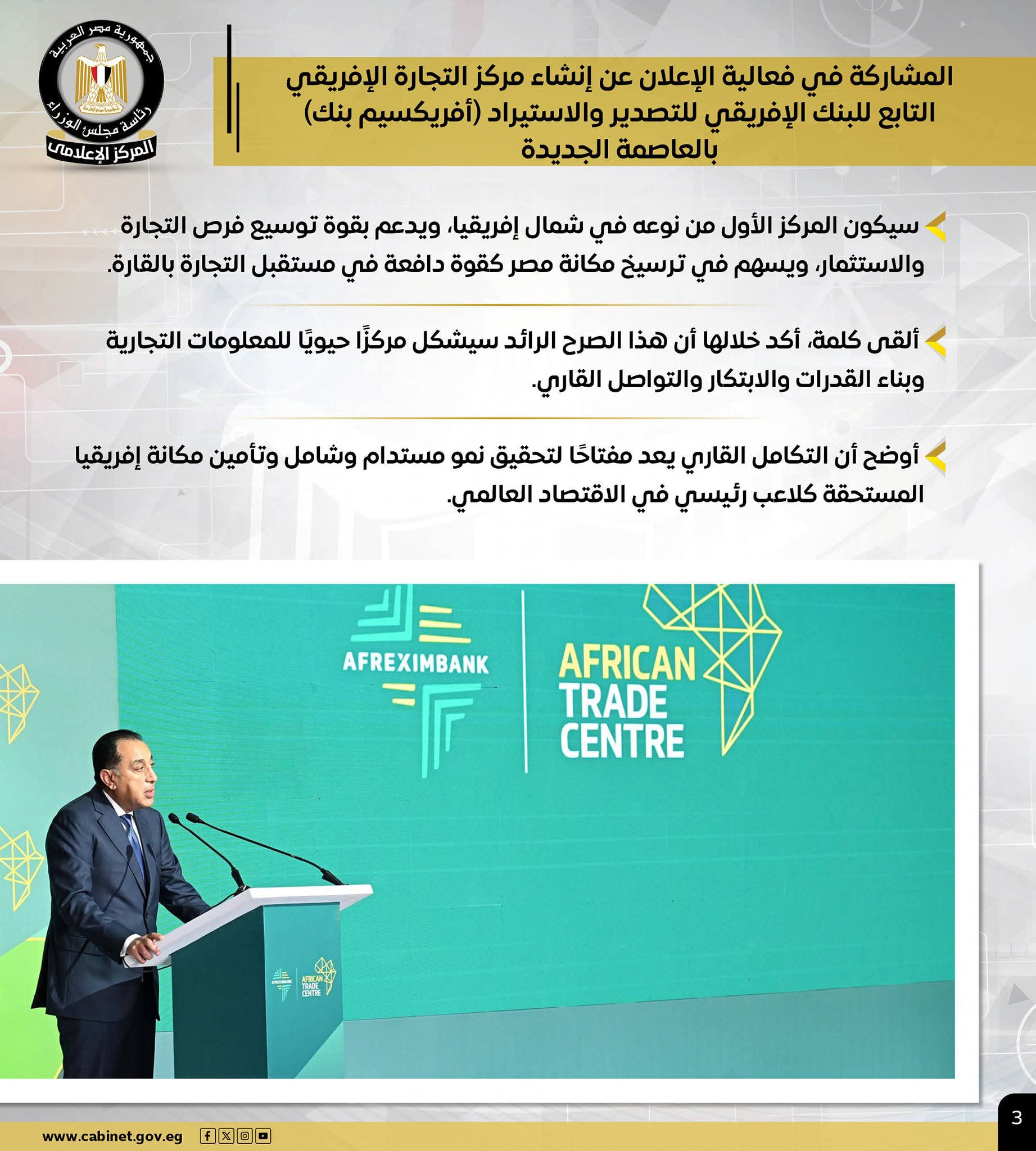 – رئيس الوزراء: إنشاء مركز التجارة الإفريقي بالعاصمة الجديدة نقلة نوعية لترسيخ مكانة مصر كقوة دافعة في مستقبل التجارة بالقارة