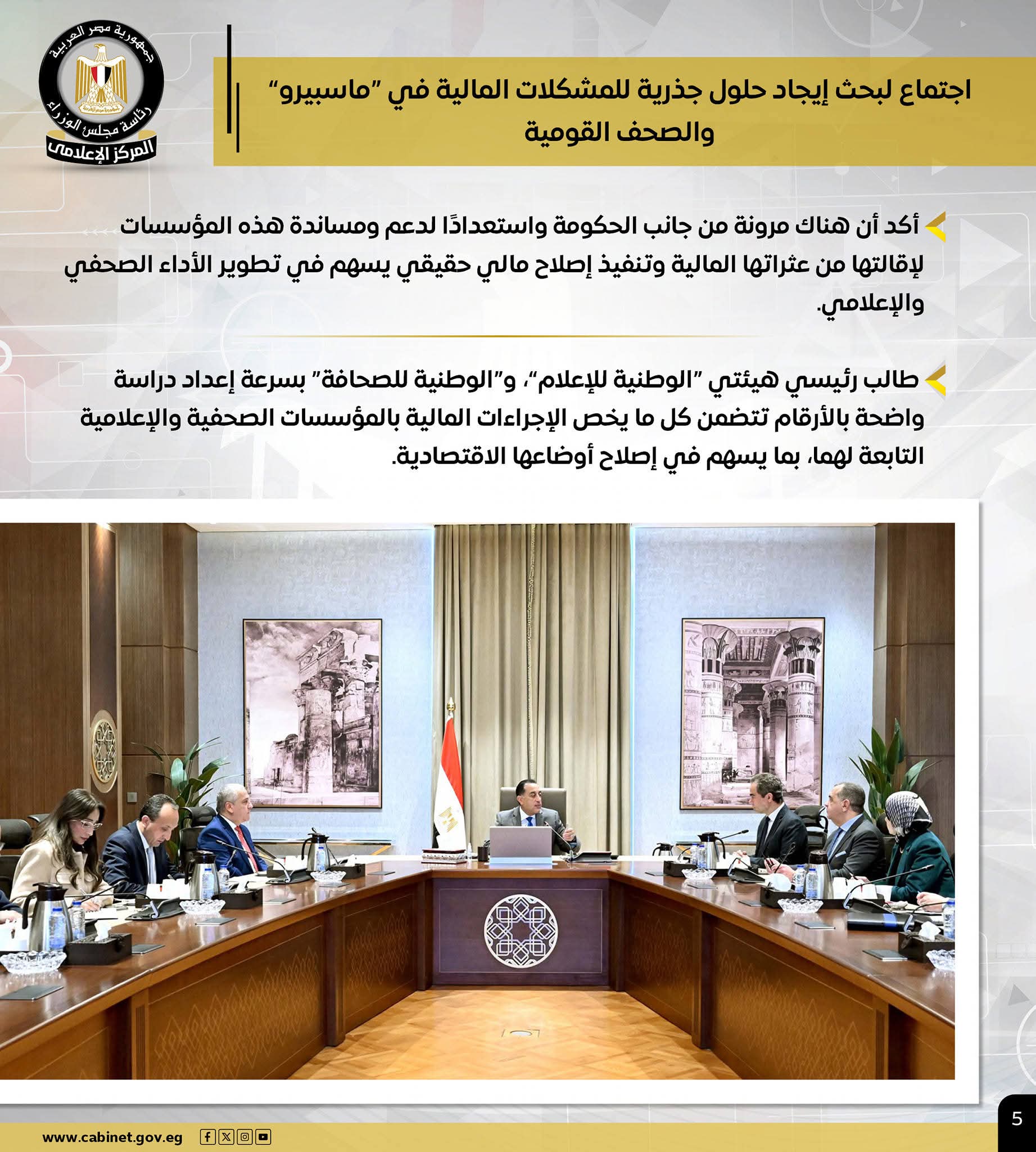 – الحكومة تبحث وضع حلول جذرية للمشكلات المالية لـ “ماسبيرو” والصحف القومية