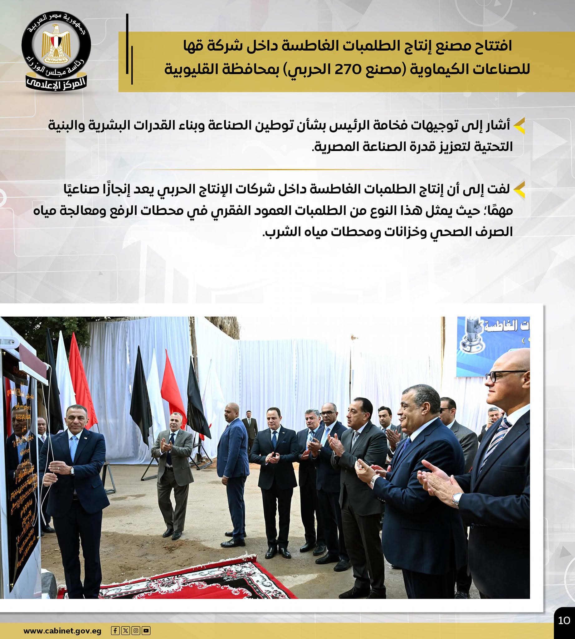 – خلال افتتاحه مصنع الطلمبات الغاطسة.. رئيس الوزراء: إنتاج هذا النوع من الطلمبات في شركات الإنتاج الحربي يعد إنجازًا صناعيًا مهمًا