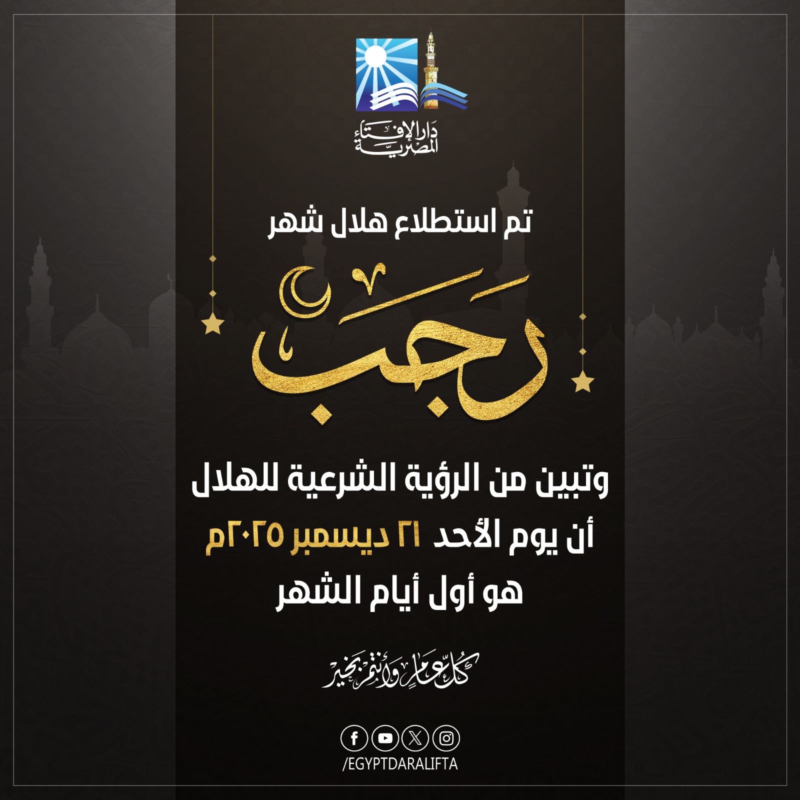 استطلعَت دارُ الإفتاءِ المصريةُ هلالَ شهرِ رجب لعام ألفٍ وأربعمائةٍ وسبعة وأربعين هجريًّا بعد غروب شمس يوم السبت التاسع والعشرين من شهر جمادى الآخرة لعام ألفٍ وأربعمائةٍ وسبعة وأربعين هجريًّا، الموافق العشرين من شهر ديسمبر لعام ألفين وخمسة وعشرين ميلاديًّا بواسطة اللِّجان الشرعيةِ والعلميةِ المنتشرةِ في أنحاء الجمهورية. وقد تحقَّقَ لدينا شرعًا من نتائج هذه الرؤية البصرية الشرعية الصحيحة ثبوتُ رؤية هلالِ شهر رجب لعامِ ألفٍ وأربعمائةٍ وسبعة وأربعين هجريًّا. وعلى ذلك تُعلن دارُ الإفتاءِ المصريةُ أن يومَ الأحد الموافق الواحد والعشرين من شهر ديسمبر لعام ألفين وخمسة…