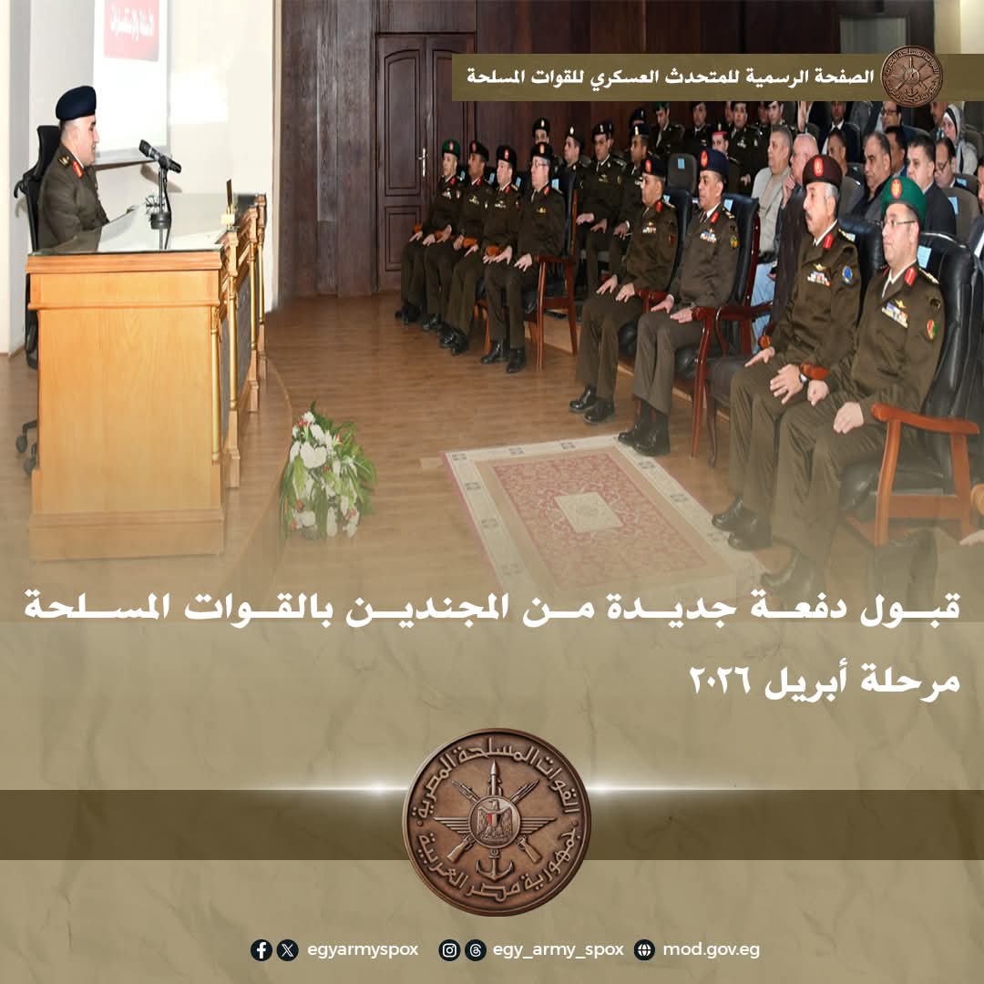 صدق الفريق أول / عبدالمجيد صقر القائد العام للقوات المسلحة وزير الدفاع والإنتاج الحربى على الإعلان عن قبول دفعة جديدة من المجندين المرحلة التجنيدية الثانية أبريل 2026 ، جاء ذلك خلال وقائع المؤتمر الصحفى الذى عقده اللواء / أحمد مصطفى صادق مدير إدارة التجنيد والتعبئة والذى أشار فيه إلى كافة التفاصيل الخاصة بقبول الدفعة الجديدة المنتظر إنضمامها لتأدية الخدمة العسكرية ، والمقرر إستقبالهم بمكاتب التجنيد والتعبئة إعتباراً من يوم السبت الموافق 27 / 12 / 2025 وذلك وفقاً للشروط الآتية :-