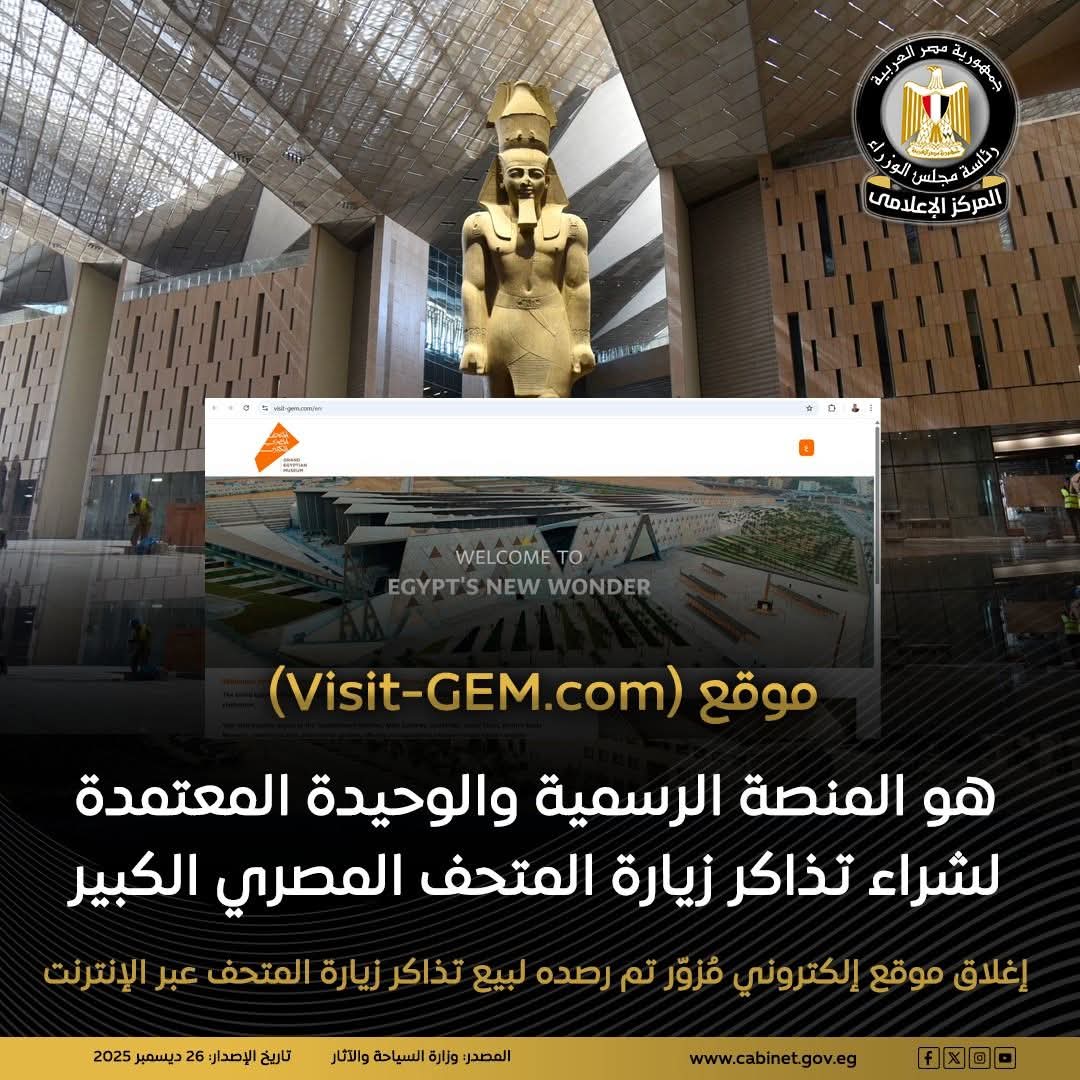 في إطار حرص وزارة السياحة والآثار على حماية حقوق زائري المتحف المصري الكبير، وضمان حصولهم على خدمات موثوقة وآمنة: تم التعامل مع موقع إلكتروني مُزوّر، تم رصده مؤخرًا على شبكة الإنترنت، لبيع تذاكر زيارة المتحف المصري الكبير. تم اتخاذ كافة الإجراءات القانونية اللازمة، وإخطار الجهاز القومي لتنظيم الاتصالات والجهات المعنية؛ الأمر الذي أسفر عن إغلاق الموقع المخالف. تؤكد الوزارة أن الموقع الإلكتروني الرسمي والوحيد المعتمد لشراء تذاكر زيارة المتحف المصري الكبير هو (visit-gem.com) فقط. ولا توجد أي مواقع إلكترونية أخرى مخولة أو معتمدة لبيع التذاكر أو تقديم…