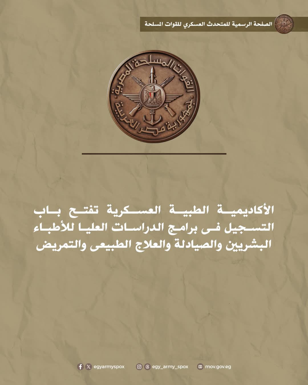 الأكاديمية الطبية العسكرية تفتح باب التسجيل فى برامج الدراسات العليا للأطباء البشريين والصيادلة والعلاج الطبيعى والتمريض