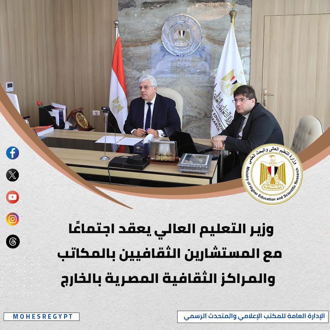 عقد الدكتور أيمن عاشور، وزير التعليم العالي والبحث العلمي، اجتماعًا مع المستشارين والملحقين الثقافيين العاملين بالمكاتب والمراكز الثقافية المصرية بالخارج التابعة للوزارة، وذلك في إطار متابعة أداء هذه المكاتب، وأكد الوزير ضرورة التواصل المستمر والفعال بين المكاتب والمراكز الثقافية والطلاب المصريين الدارسين بالخارج، والعمل على احتضانهم، وتوفير قنوات اتصال مباشرة ومفتوحة لحل مشكلاتهم، وتقديم الدعم اللازم لهم، وتعزيز ارتباطهم بوطنهم، وتوجيههم بما يخدم مصالحهم العلمية والوطنية.