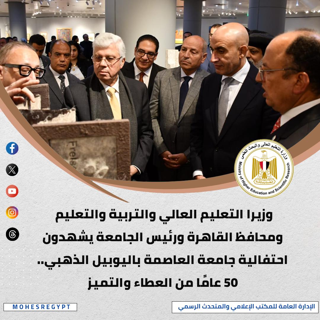 شهد الدكتور أيمن عاشور وزير التعليم العالي والبحث العلمي، احتفالية جامعة العاصمة (حلوان سابقًا) باليوبيل الذهبي لإبراز 50 عامًا من الإنجازات الأكاديمية والفنية وخططها الطموحة لمستقبل مشرق بعد تغيير اسمها، وفي كلمته أشار د.أيمن عاشور إلى أن الجامعة حققت إنجازات أكاديمية وبحثية ملموسة، شملت تطوير البرامج الدراسية، وتعزيز البحث العلمي، وتوسيع الشراكات محليًّا ودوليًّا، فضلًا عن إسهاماتها في الابتكار وخدمة التنمية المستدامة بما يتماشى مع رؤية الدولة 2030، مؤكدًا أن خريجي الجامعة يشكلون ثروتها الحقيقية، فقد أنجبت شخصيات عامة ورموزًا مؤثرة في العمل الوطني والدولي، من وزراء وقادة منظمات دولية وعلماء وباحثين وأطباء ومهندسين، إضافة إلى شخصيات بارزة في الإعلام والفنون والاقتصاد والإدارة، الذين جسدوا قيم الجامعة في التميز والمسؤولية المجتمعية، مؤكدين نجاح رسالتها في إعداد كوادر قيادية قادرة على صنع التغيير والمساهمة الفاعلة في المستقبل.