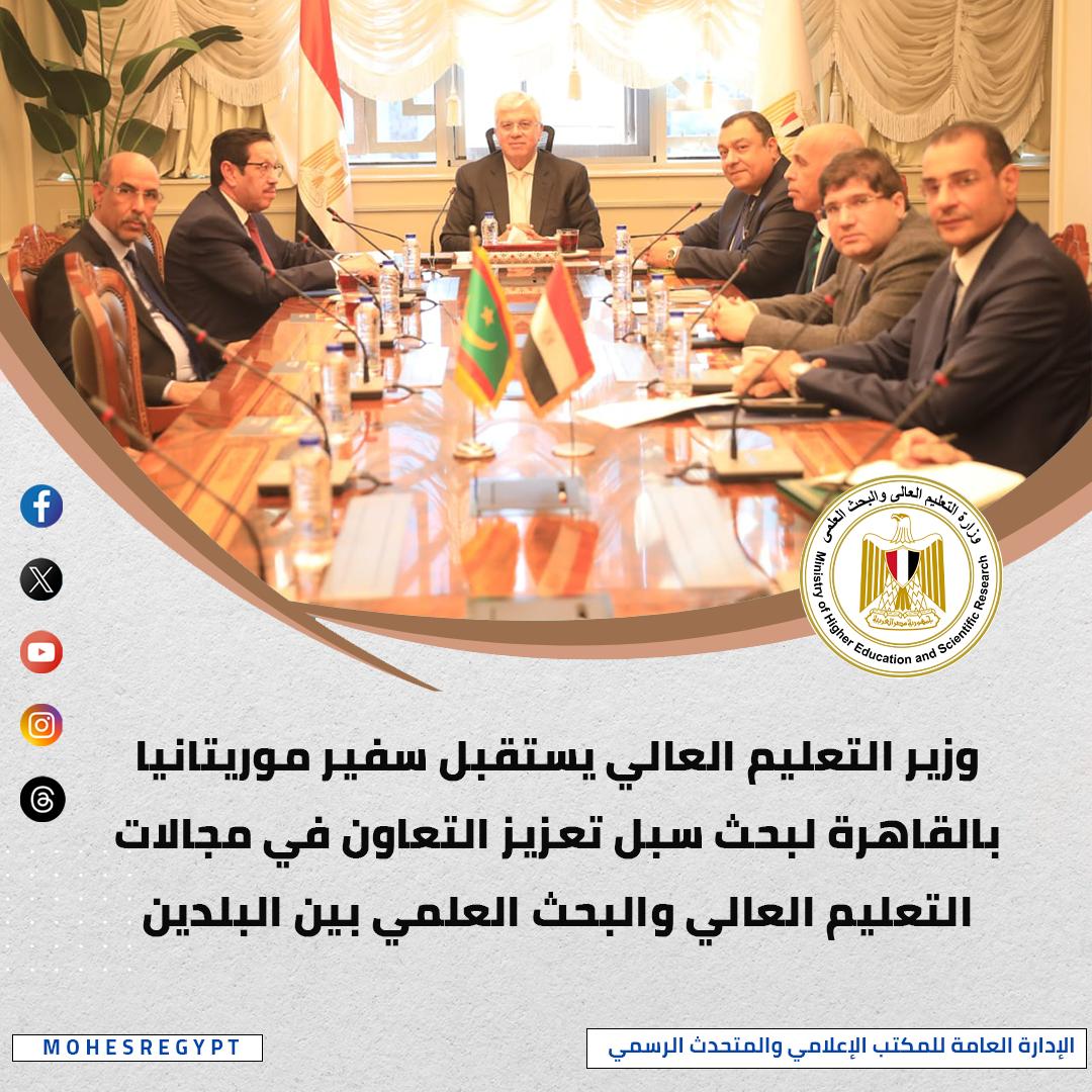 استقبل د.أيمن عاشور وزير التعليم العالي والبحث العلمي، السفير/ الحسين سيدي عبد الله الدية سفير موريتانيا بالقاهرة؛ لبحث سبل التعاون بين مصر وموريتانيا فى المجالات التعليمية والبحثية، وخلال اللقاء، بحث الجانبان سبل تعزيز التعاون التعليمي والبحثي بين البلدين، مع التركيز على دعم الطلاب الموريتانيين بالجامعات المصرية، وتذليل التحديات التي تواجههم، وإمكانية زيادة المنح الدراسية المقدمة للطلاب الموريتانيين، بالإضافة إلى تعزيز التعاون في المشروعات البحثية ذات الاهتمامات المشتركة.