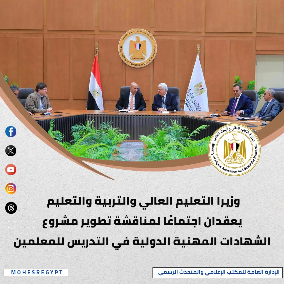 عقد الدكتور أيمن عاشور وزير التعليم العالي والبحث العلمي، اجتماعًا مع السيد محمد عبداللطيف وزير التربية والتعليم والتعليم الفني، لمناقشة تطوير مشروع الشهادات المهنية الدولية في التدريس للمعلمين، وذلك في إطار تعزيز التعاون المؤسسي بين الوزارتين، ودعم جهود الارتقاء بكفاءة المعلم وبناء قدراته المهنية وفق أحدث المعايير الدولية، وتناول الاجتماع بحث سبل تطوير محتوى الشهادات المهنية، وآليات تنفيذها، بما يواكب احتياجات منظومة التعليم، ويسهم في تحسين جودة العملية التعليمية، وربط التطوير المهني المستمر للمعلمين بمسارات واضحة ومعتمدة، وأكد الجانبان أهمية استمرار التنسيق المشترك، والتوسع في برامج الشهادات المهنية، بما يدعم بناء معلم مؤهل قادر، على مواكبة التطورات التربوية والتكنولوجية، وتحقيق مستهدفات الدولة في تطوير التعليم.