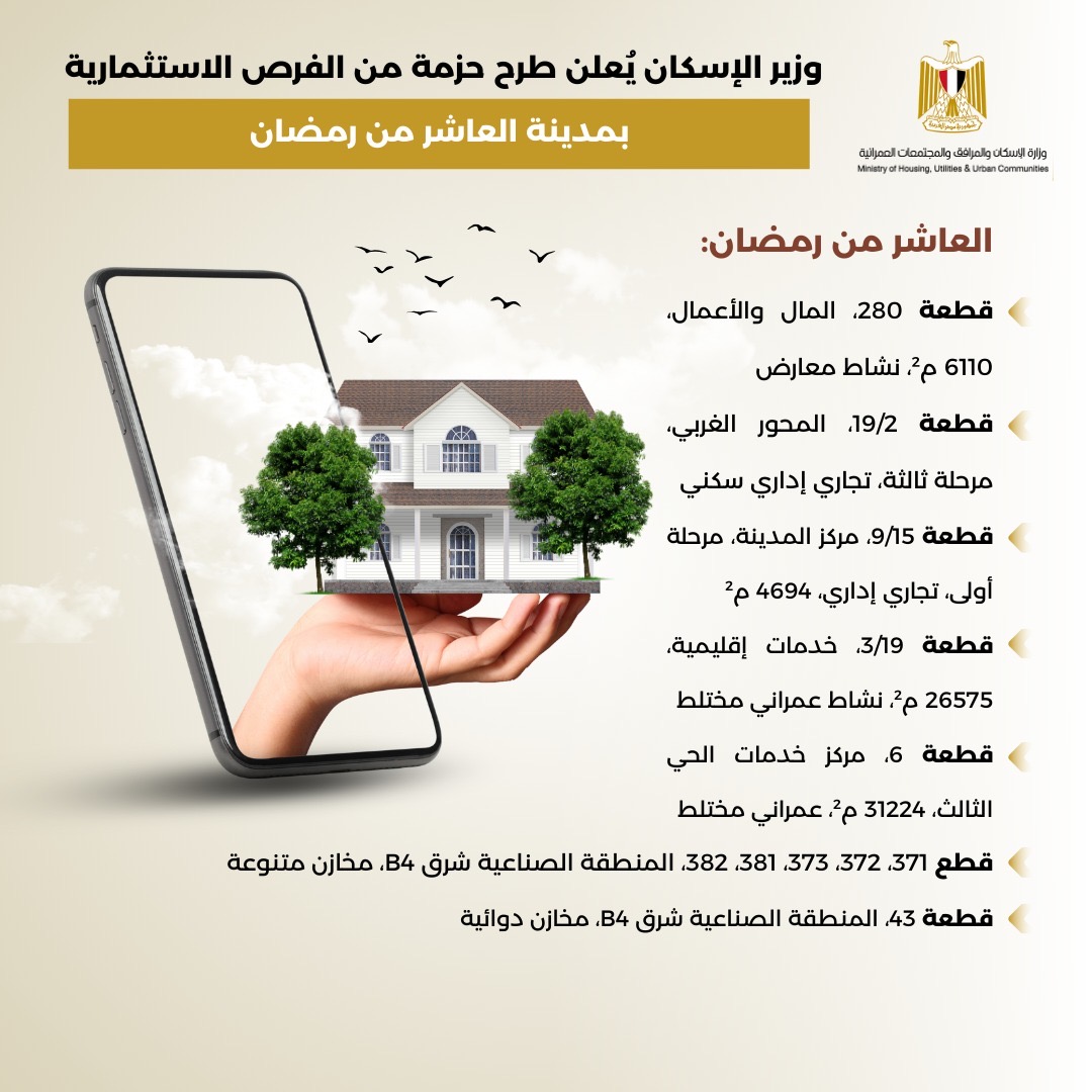 وفي هذا الإطار، تم طرح عدداً من الأراضي بمدينة العاشر من رمضان، على الموقع الإلكترونى لبوابة خدمات المستثمرين وتشمل القطعة رقم 280 بنشاط معارض بمنطقة المال والأعمال مرحلة ثالثة بمساحة 6110 أمتار، والقطعة رقم 19/2 بالمحور الغربي مرحلة ثالثة بنشاط تجاري إداري سكني، وقطعة رقم 9/15 مركز المدينة مرحلة أولى بنشاط تجاري إداري بمساحة 4694 مترا، والقطعة رقم 3/19 بنشاط عمراني مختلط بمنطقة الخدمات الإقليمية بمساحة 26575 مترا، والقطعة رقم 6 بمركز خدمات الحي الثالث بنشاط عمراني مختلط بمساحة 31224 مترا، والقطع أرقام( 371 – 372 – 373 – 381 – 382 ) بالمنطقة الصناعية شرق b٤ بأنشطة مخازن ماعدا الدوائي والغذائي بمساحات متنوعة، والقطعة رقم 43 بالمنطقة الصناعية شرق b٤ بنشاط مخازن دوائية.