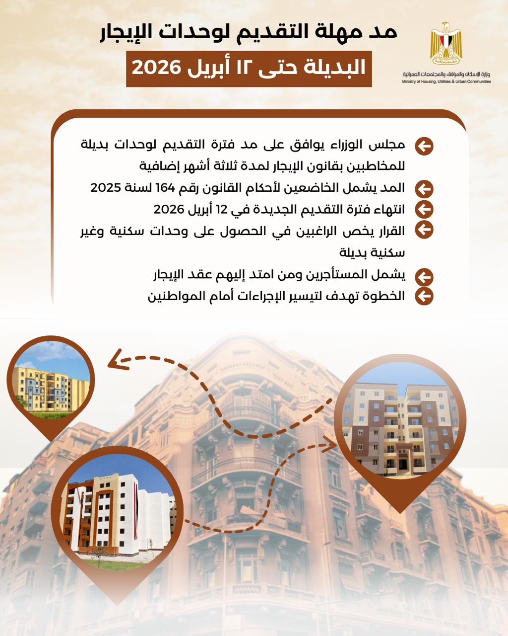 وزارة الاسكان : مد فترة التقديم لمدة 3 شهور اضافية للحصول على وحدات بديلة وفقا لقانون الايجار القديم 6 يناير، 20266 يناير، 2026 admin مد فترة التقديم لمدة 3 شهور اضافية للحصول على وحدات بديلة وفقا لقانون الايجار القديم