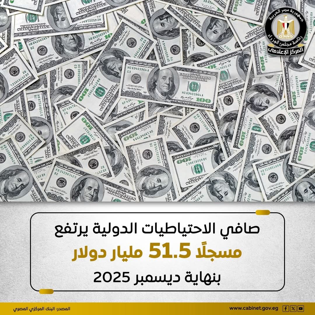 مجلس الوزراء : صافي الاحتياطيات الدولية يحقق زيادة قدرها 4.4 مليارات دولار خلال عام 2025
