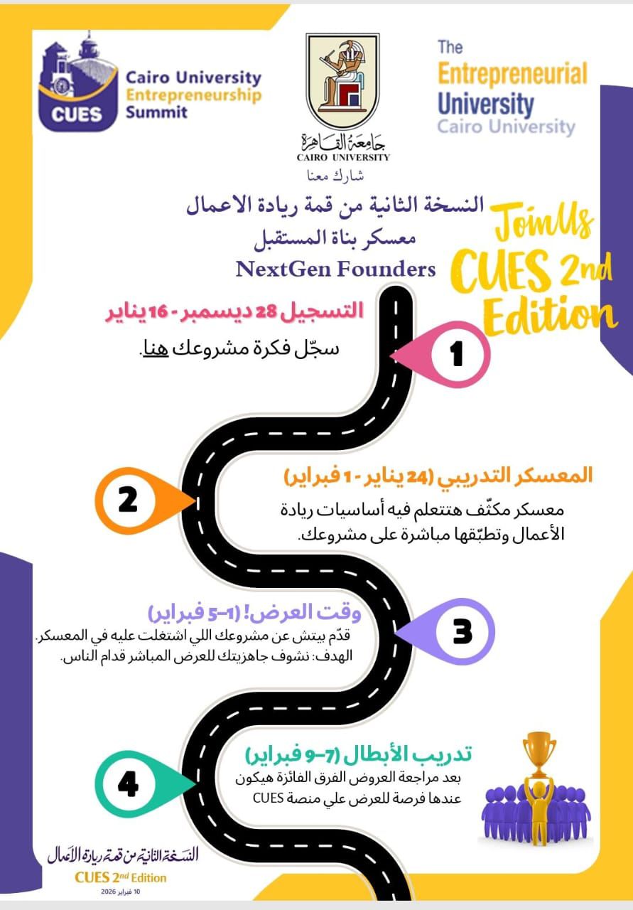 في فرصة استثنائية، نعلن عن انطلاق معسكر بناة المستقبل NextGen Founder، إحدى المبادرات النوعية الهادفة إلى تمكين الطلاب الطموحين وتحويل أفكارهم المبتكرة إلى مشروعات واقعية قابلة للنمو والتأثير. ويأتي إطلاق هذا المعسكر تأكيدًا جديدًا على الدور الريادي لجامعة القاهرة، وفي إطار قبول تحالف «الجامعة الريادية» ضمن المبادرة التنافسية الرئاسية «تحالف وتنمية» التي تنفذها وزارة التعليم العالي والبحث العلمي، بما يجسد توجه الدولة نحو دعم الابتكار وريادة الأعمال وتعزيز دور الجامعات كمحرك رئيسي للتنمية الاقتصادية المستدامة. ويمثل المعسكر تجربة تدريبية مكثفة تجمع بين التعلم التطبيقي والتوجيه العملي، حيث يعمل المشاركون…