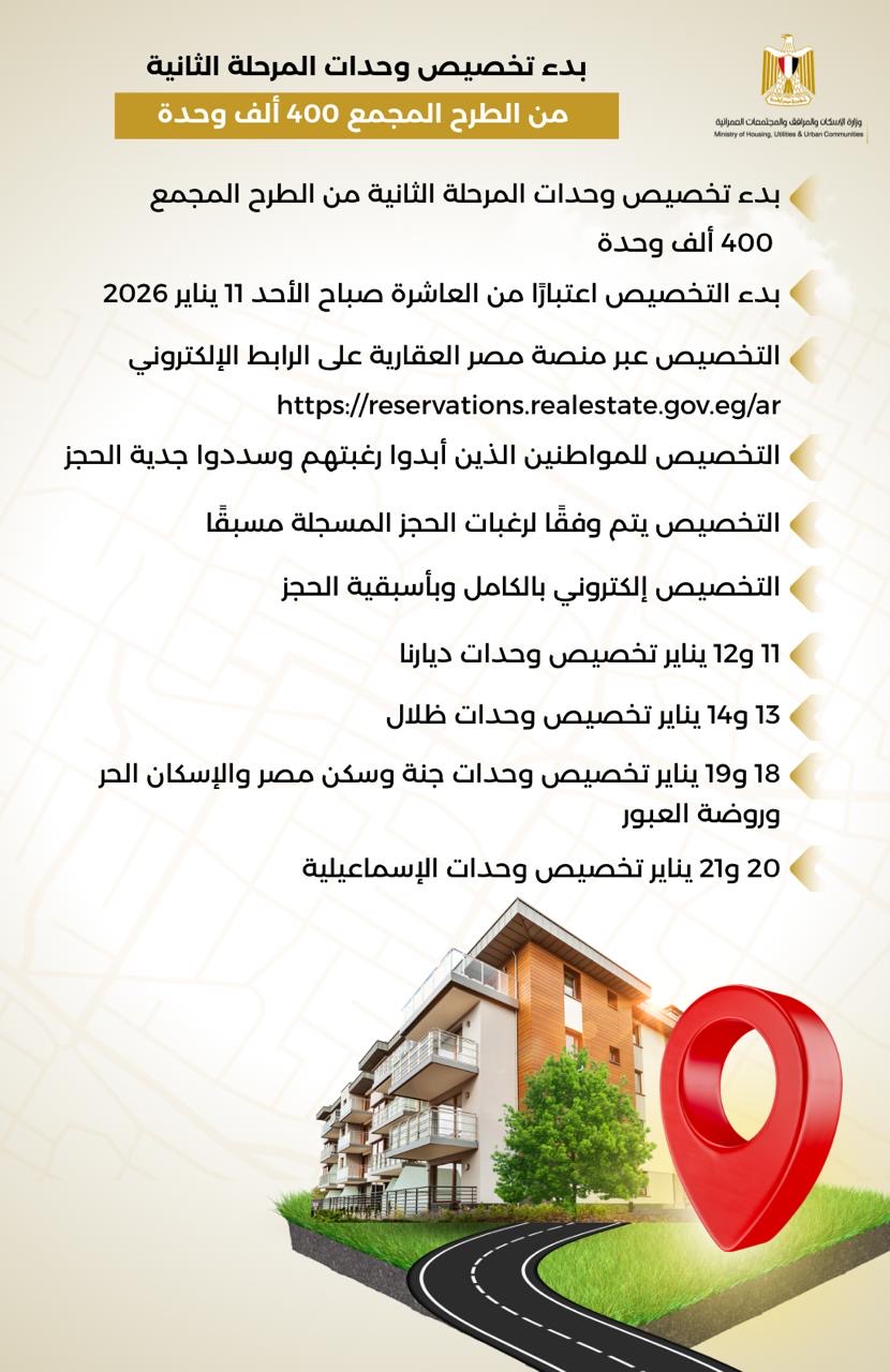 أعلنت وزارة الإسكان والمرافق والمجتمعات العمرانية، عن البدء في تخصيص الوحدات السكنية للمرحلة الثانية من الطرح المجمع ٤٠٠ ألف وحدة عبر منصة مصر العقارية، وذلك اعتباراً من الساعة العاشرة صباح غد الأحد الموافق ١١/١/٢٠٢٦، لكافة المواطنين الذين قاموا بإبداء رغبتهم في حجز وحداتهم وقاموا بسداد جدية الحجز وفقا لرغباتهم.