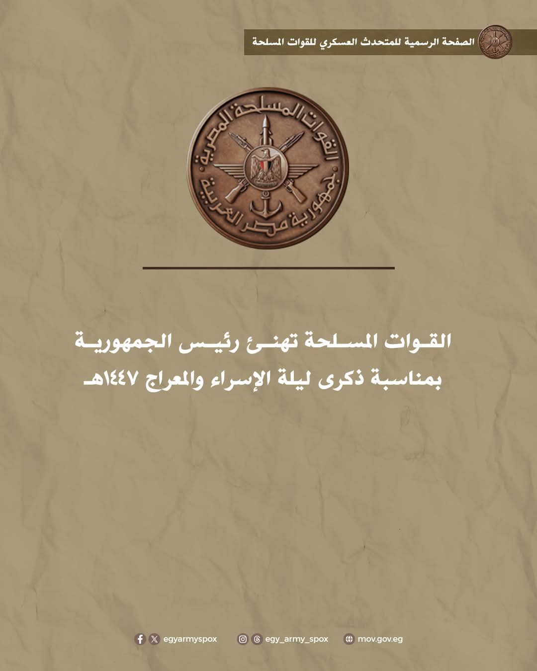 بعث الفريق أول / عبد المجيد صقر القائـد العـام للقـوات المسلحـة وزيـر الدفـاع والإنتـاج الحربـى ببرقيـة تهنئـة للسيـد الرئيس / عبد الفتاح السيسى رئيس الجمهورية القائد الأعلى للقوات المسلحة بمناسبـة الإحتفال بذكرى ليلة الإسراء والمعراج لعام 1447هـ جاء نصها :