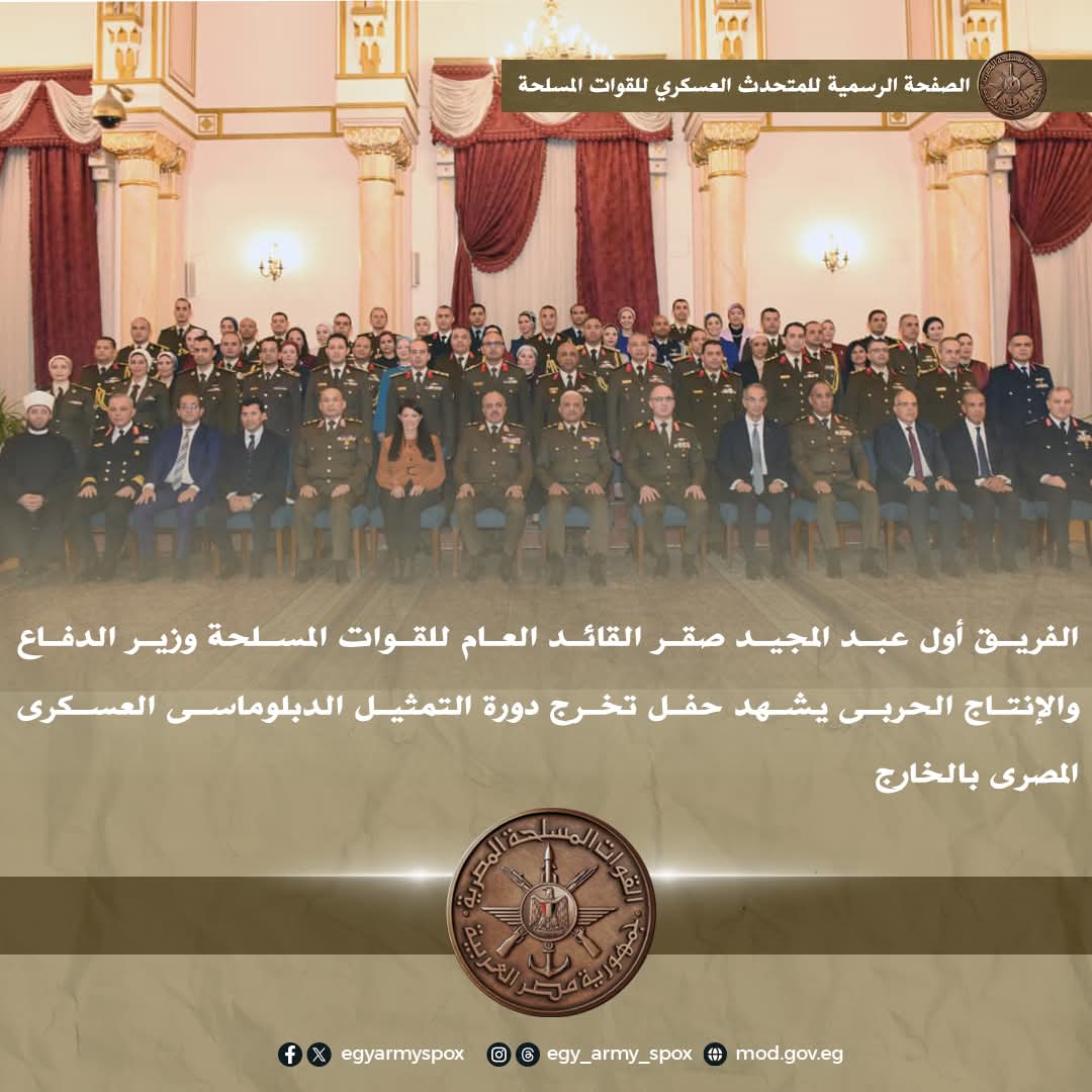 شهد الفريق أول / عبد المجيد صقر القائد العام للقوات المسلحة وزير الدفاع والإنتاج الحربى حفل تخرج دورة التمثيل الدبلوماسى العسكرى المصرى بالخارج ، وذلك بحضور الفريق / أحمد خليفة رئيس أركان حرب القوات المسلحة وعدد من الوزراء وقادة الأفرع الرئيسية وعدد من قادة القوات المسلحة والشخصيات العامة وممثلى وزارة الخارجية .