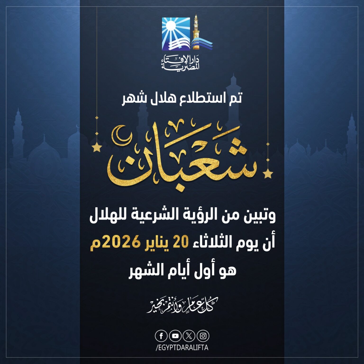 وعلى ذلك تُعلن دارُ الإفتاءِ المصريةُ أن يومَ الإثنين الموافق التاسع عشر من شهر يناير لعام ألفين وستة وعشرين ميلاديًّا هو المتمم لشهر رجب لعام ألف وأربعمائة وسبعة وأربعين هجريًّا، وأن يوم الثلاثاء الموافق العشرين من شهر يناير لعام ألفين وستة وعشرين ميلاديًّا هو أول أيام شهر شعبان لعام ألف وأربعمائة وسبعة وأربعين هجريًّا.