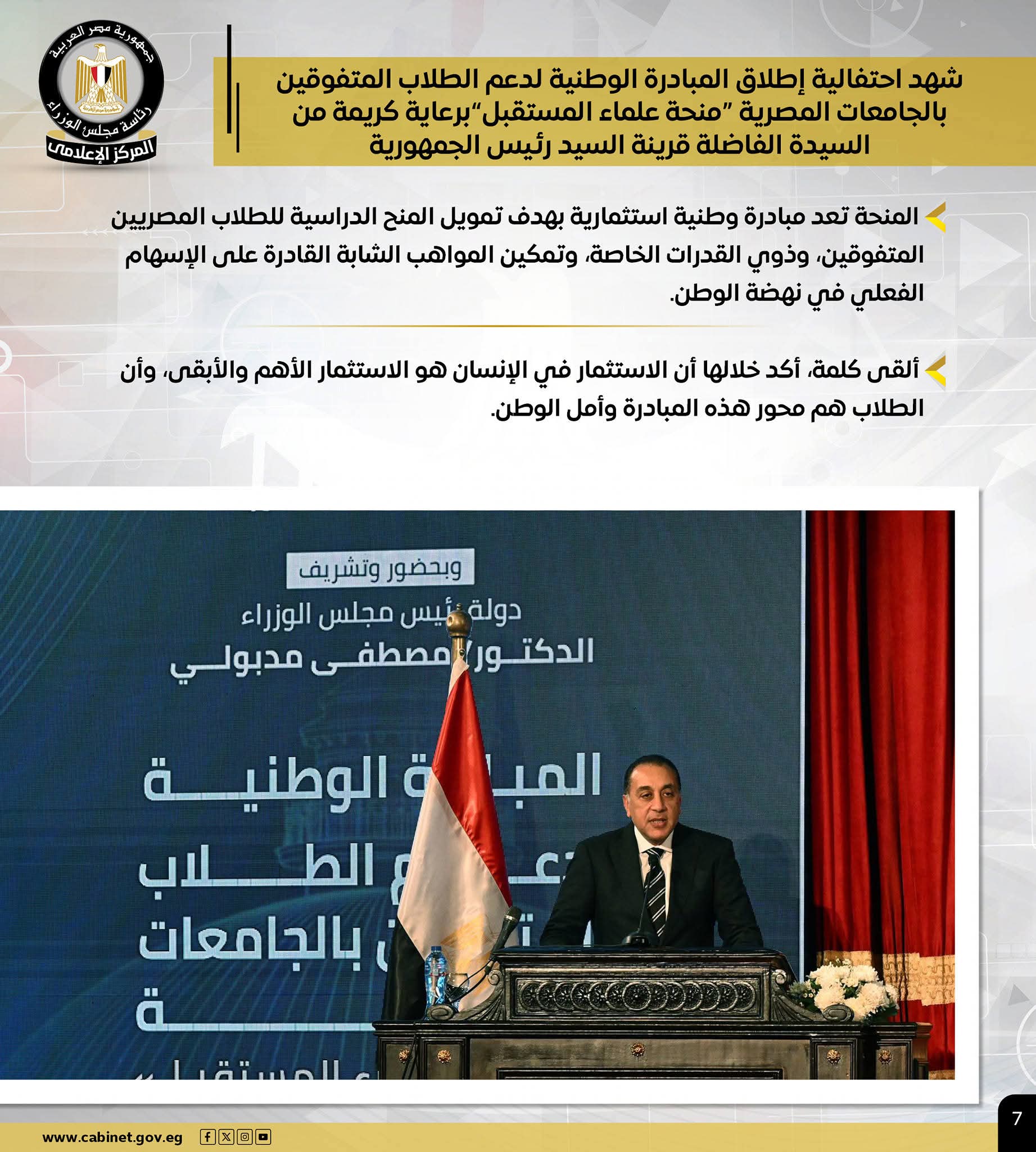 – رئيس الوزراء خلال احتفالية إطلاق مبادرة “منحة علماء المستقبل”.. الاستثمار في الإنسان هو الأهم والأبقى