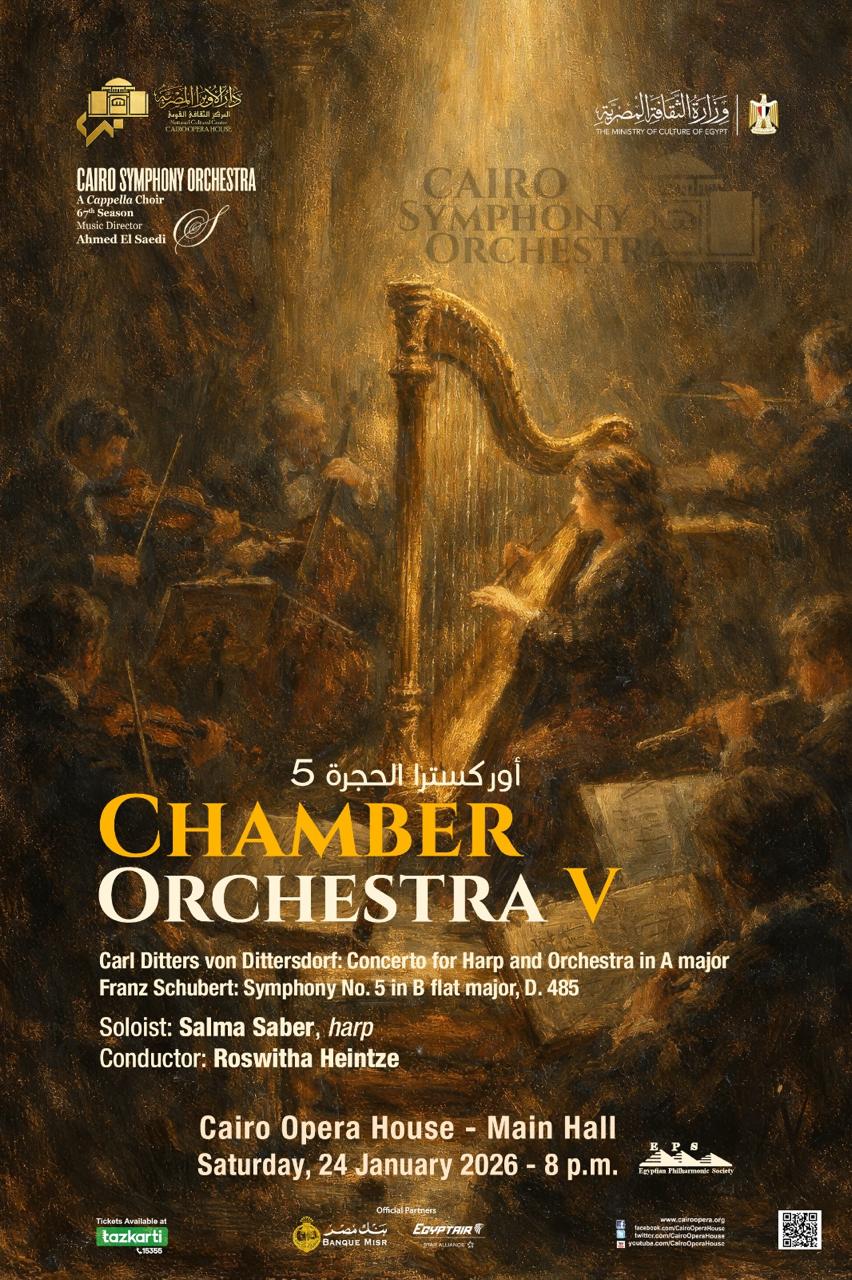 تقيم دار الأوبرا المصرية برئاسة الدكتور علاء عبد السلام حفلاً لأوركسترا القاهرة السيمفونى تحت إشراف مديره الفنى والقائد الأساسى المايسترو أحمد الصعيدى وتقوده المايسترو الألمانية روزويتا هاينتزه وتشارك خلاله عازفة الهارب سلمى صابر وذلك فى الثامنة مساء السبت ٢٤ يناير على المسرح الكبير .
