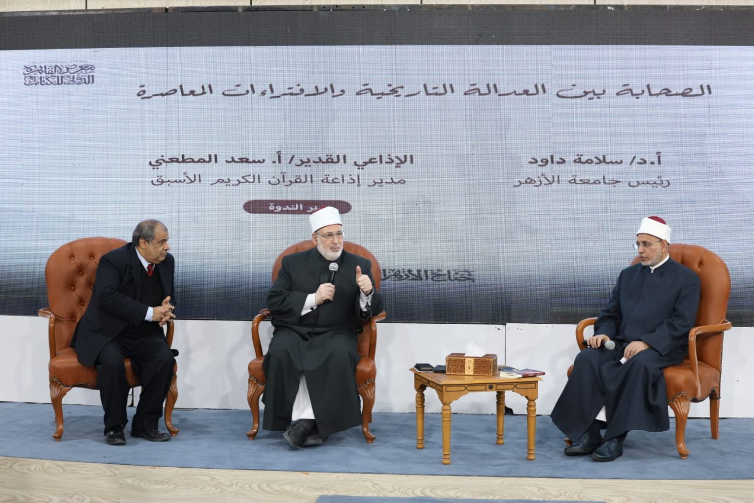 نظم جناح الأزهر الشريف بمعرض القاهرة الدولي للكتاب، في دورته السابعة والخمسين، اليوم الجمعة، ندوة بعنوان «الصحابة بين العدالة التاريخية والافتراءات المعاصرة»، بمشاركة فضيلة أ.د/ محمد الضويني وكيل الأزهر الشريف، أ.د/ سلامة داود، رئيس جامعة الأزهر، وأدارها الإعلامي أ. سعد المطعني، وذلك في إطار مناقشة مكانة السنة النبوية والعدالة التاريخية للصحابة وكيفية مواجهة الافتراءات المعاصرة.