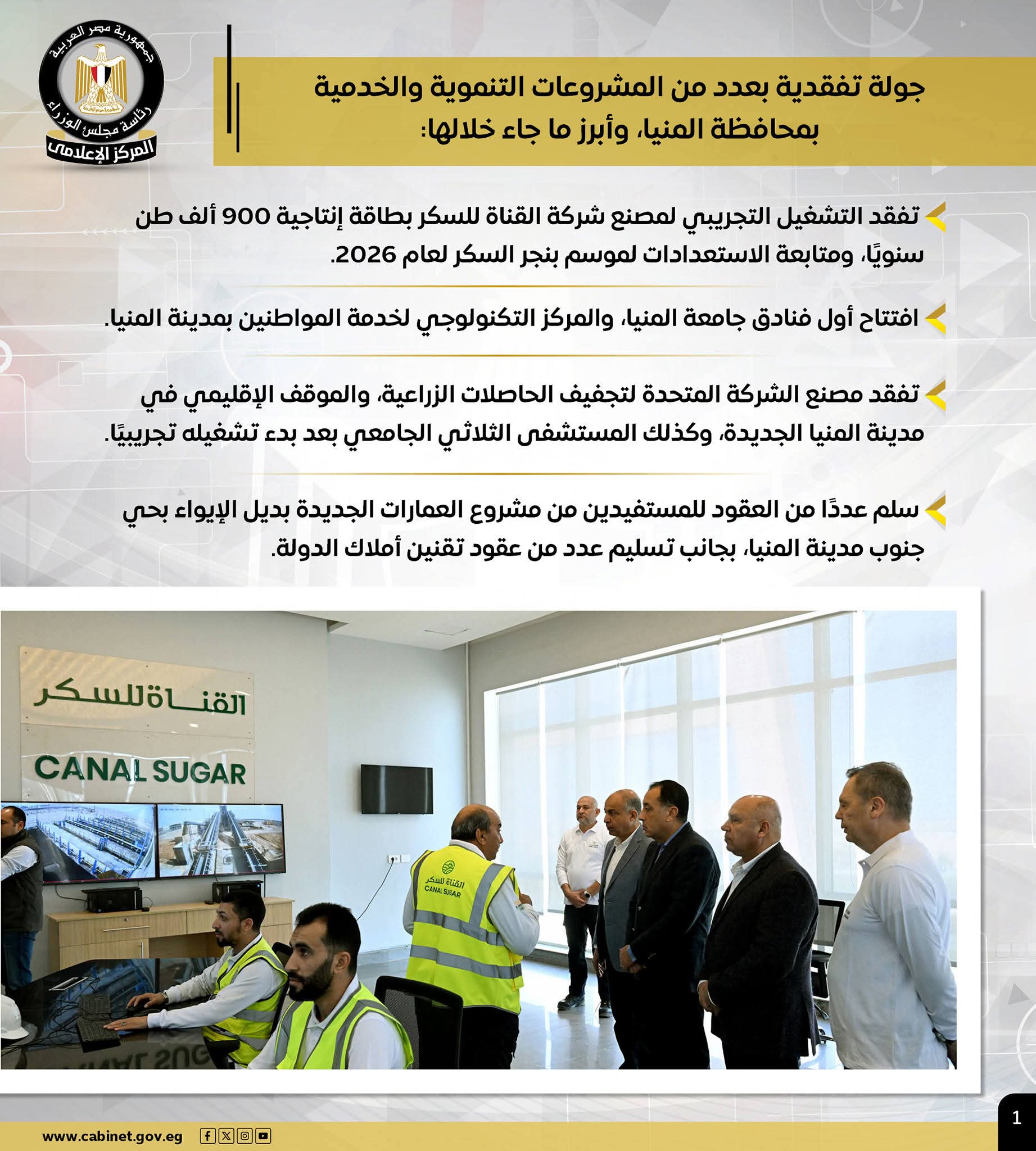 – خلال جولته بالمنيا رئيس الوزراء يتفقد التشغيل التجريبي لمصنع شركة القناة للسكر واستعدادات موسم بنجر السكر 2026