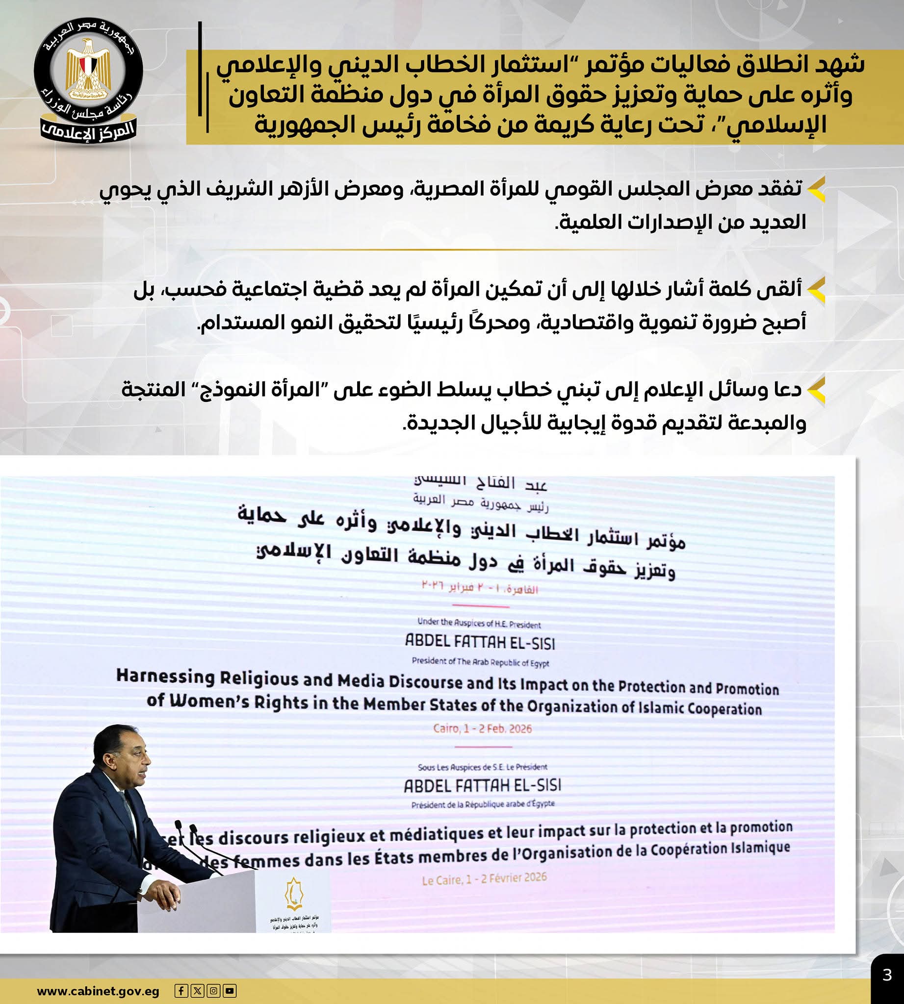 – خلال مؤتمر “استثمار الخطاب الديني والإعلامي وأثره على حماية وتعزيز حقوق المرأة”.. رئيس الوزراء: تمكين المرأة أصبح ضرورة تنموية واقتصادية