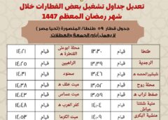 في إطار حرص الهيئة القومية لسكك حديد مصر التيسير على جمهور الركاب خلال شهر رمضان المبارك، تقرر تعديل مواعيد بعض القطارات على عدد من خطوط الشبكة بما يتماشى مع طبيعة التشغيل وخدمة جمهور الركاب خلال الشهر الكريم، وذلك اعتبارًا من يوم الاربعاء الموافق 18 فبراير 2026، ومع بدء شهر رمضان المعظم كالتالى : – وقوف قطار رقم 3017 (ثالثة مكيفة) القاهرة / المنصورة بمحطتي قويسنا وبركة السبع. – تعديل ميعاد قطار رقم 925 (مكيف) القاهرة / طنطا، ليقوم من محطة القاهرة الساعة 18:45 ، ويصل محطة طنطا الساعة 20:10. –…