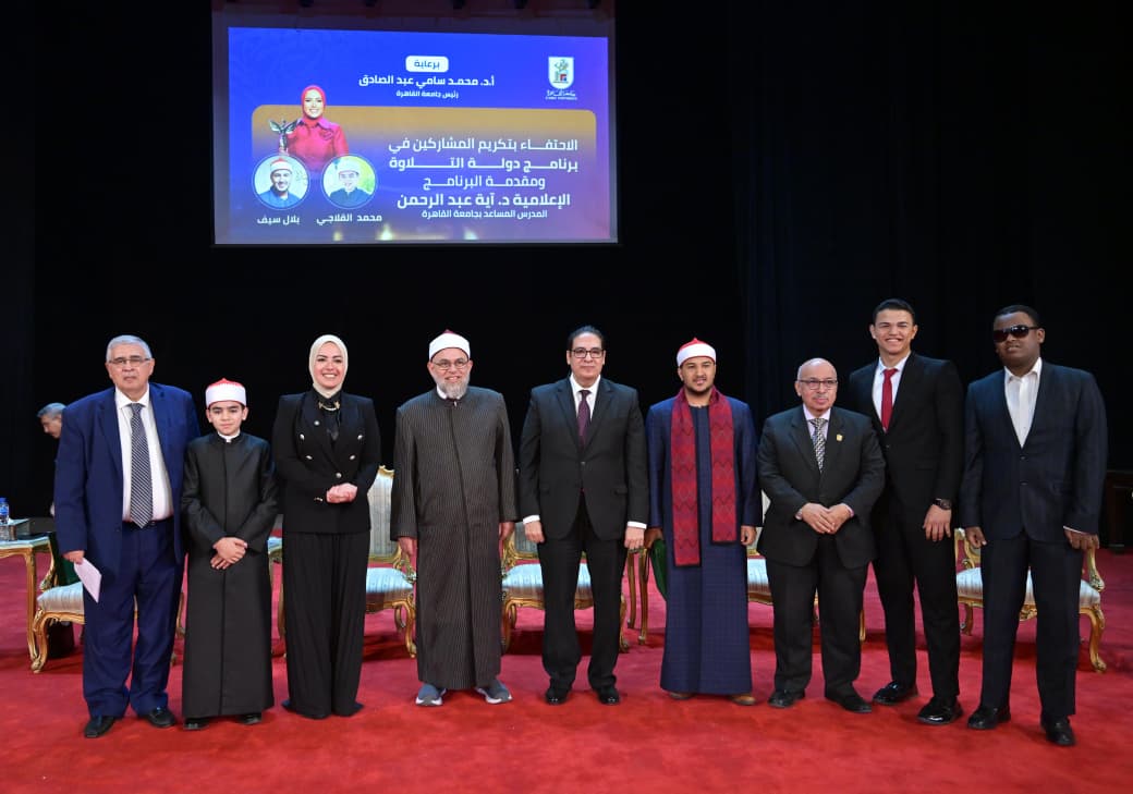 استأنفت جامعة القاهرة، برعاية الدكتور محمد سامي عبد الصادق رئيس الجامعة، فعاليات الموسم الثقافي مع بداية الفصل الدراسى الثانى للعام الجامعي 2025-2026 حيث شهدت قاعة الاحتفالات الكبري بالجامعة لقاء مفتوحا واحتفالية لتكريم المشاركين ببرنامج ” دولة التلاوة” وهم: الإعلامية د.آية عبد الرحمن المدرس المساعد بكلية التربية النوعية بجامعة القاهرة، وعضو مجلس النواب، ومحمد القلاجي، وبلال سيف.