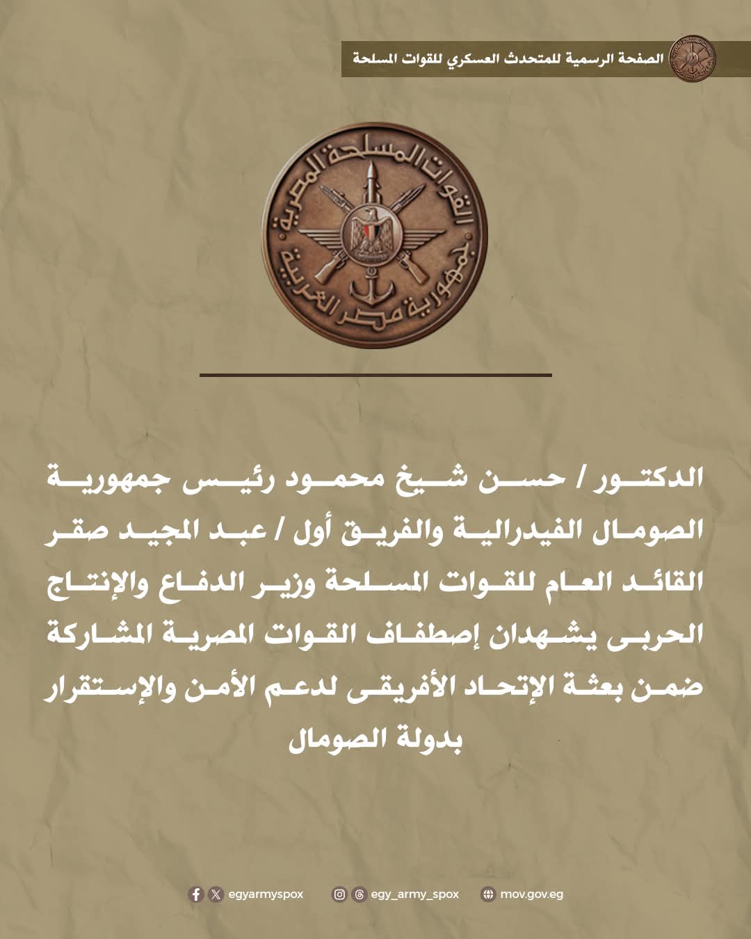 فى إطار الدور المصرى الريادى الداعم للجهود الدولية فى حفظ السلام وتعزيز ركائز الأمن والإستقرار بالقارة الأفريقية ، شهد الدكتور / حسن شيخ محمود رئيس جمهورية الصومال الفيدرالية الشقيقة يرافقه الفريق أول / عبد المجيد صقر القائد العام للقوات المسلحة وزير الدفاع والإنتاج الحربى إصطفاف القوات المصرية المشاركة ضمن بعثة الإتحاد الإفريقى لدعم وحدة الصومال وأمنه وسلامة أراضيه ، وذلك بحضور الفريق / أحمد خليفة رئيس أركان حرب القوات المسلحة وعدد من قادة القوات المسلحة .
