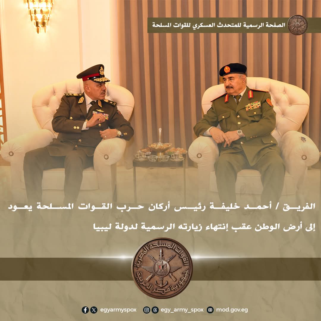 عاد إلى أرض الوطن الفريق / أحمد خليفة رئيس أركان حرب القوات المسلحة والوفد المرافق له عقب إنتهاء زيارته الرسمية لدولة ليبيا ، حيث أُجريت له مراسم إستقبال رسمية وإستعراض حرس الشرف وعزفت الموسيقات العسكرية السلام الوطنى لكلا البلدين .