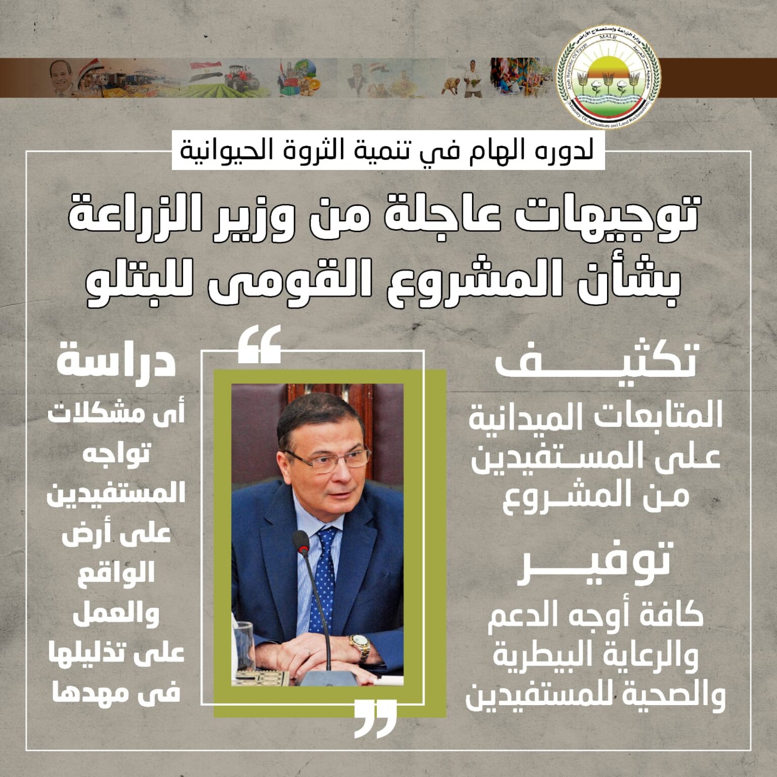 وكلف “فاروق” قطاع تنمية الثروة الحيوانية والداجنة والهيئة العامة للخدمات البيطرية بالتنسيق مع مديريات الزراعة والطب البيطرى على مستوى محافظات الجمهورية بتكثيف المتابعات الميدانية على المستفيدين من المشروع القومى للبتلو، مع توفير كافة أوجه الدعم والرعاية البيطرية والصحية ودراسة أى مشكلات تواجه المستفيدين على أرض الواقع والعمل على تذليلها فى مهدها.