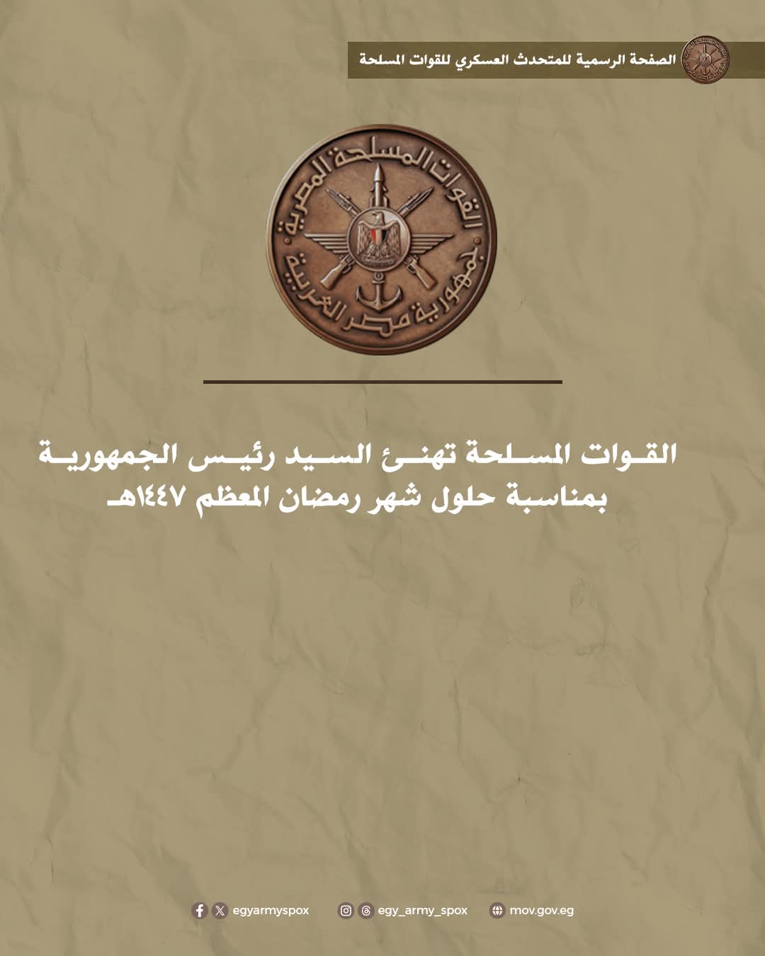 القوات المسلحة تهنئ السيد رئيس الجمهورية بمناسبة حلول شهر رمضان المعظم 1447هــ