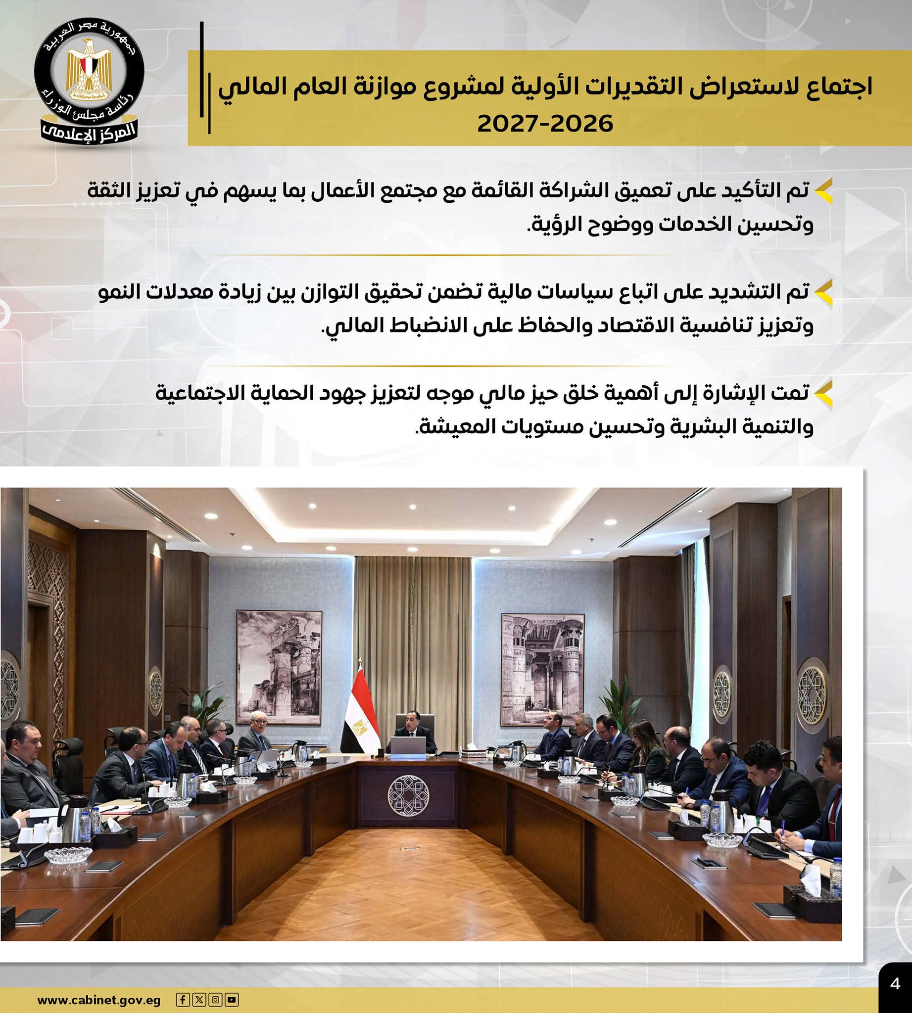 – رئيس الوزراء يستعرض التقديرات الأولية لمشروع موازنة العام المالي 2026-2027