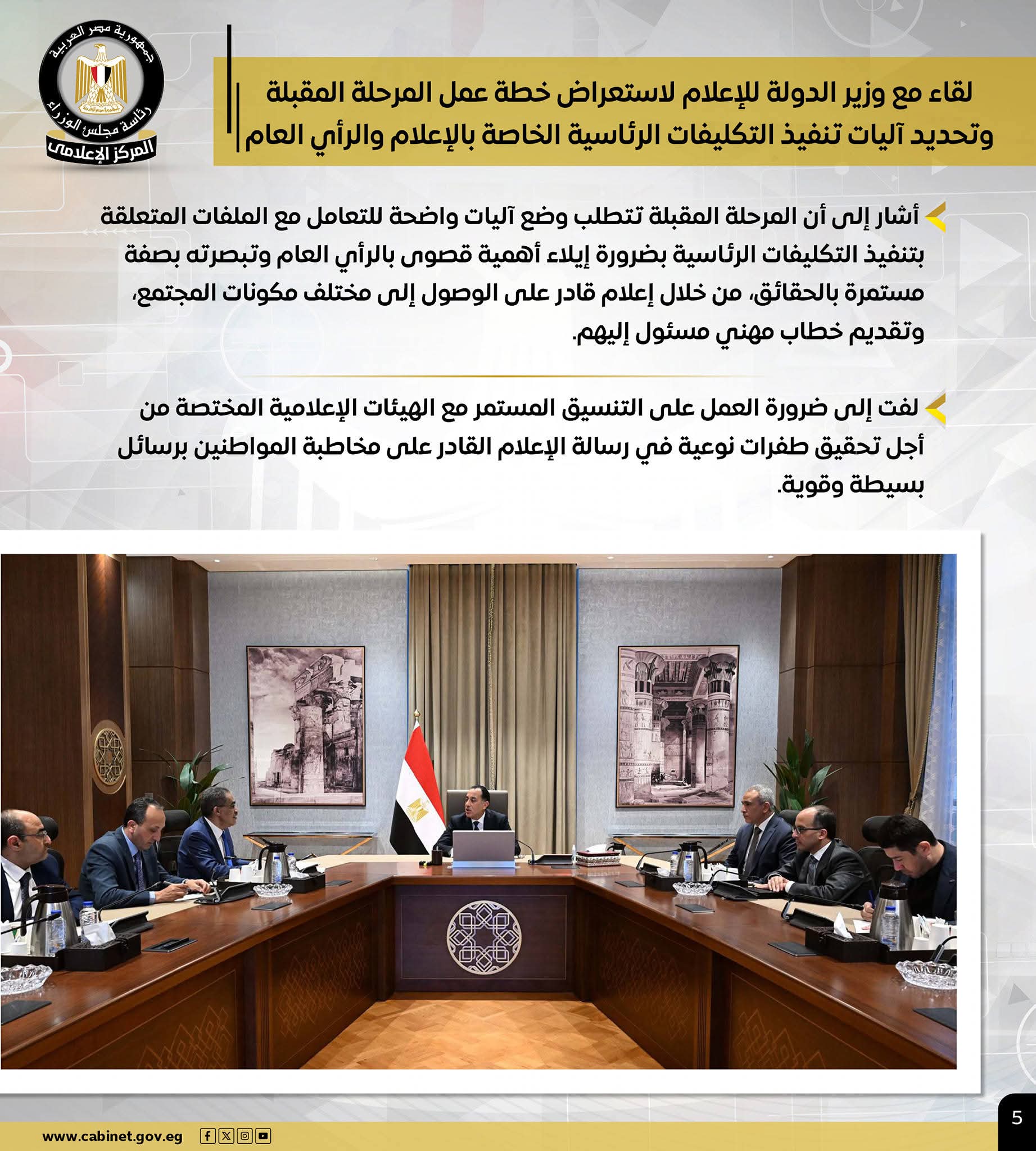 – خلال لقائه مع وزير الدولة للإعلام.. رئيس الوزراء يستعرض آليات تنفيذ التكليفات الرئاسية الخاصة بالإعلام والرأي العام